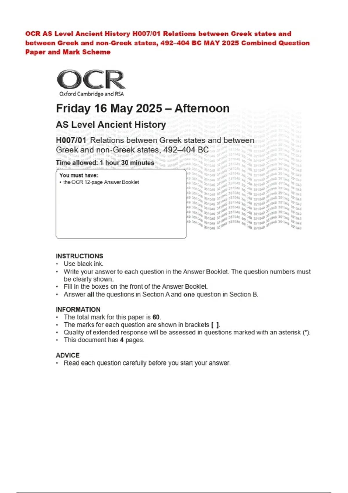 OCR AS Level Ancient History H007/01 Relations between Greek states and between Greek and non‑Greek states, 492–404 BC MAY 2025 Combined Question Paper and Mark Scheme