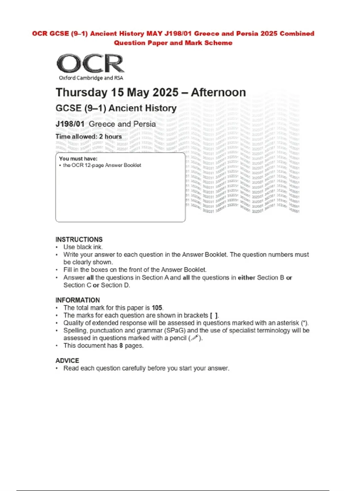 OCR GCSE (9–1) Ancient History MAY J198/01 Greece and Persia 2025 Combined Question Paper and Mark Scheme