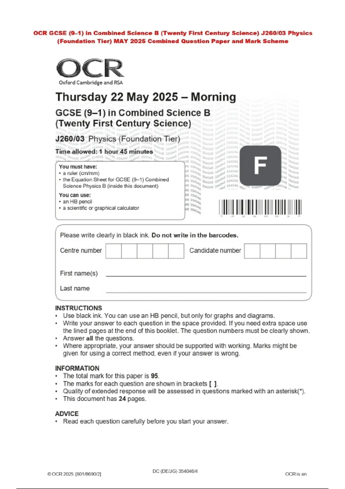OCR GCSE (9–1) in Combined Science B (Twenty First Century Science) J260/03 Physics (Foundation Tier) MAY 2025 Combined Question Paper and Mark Scheme