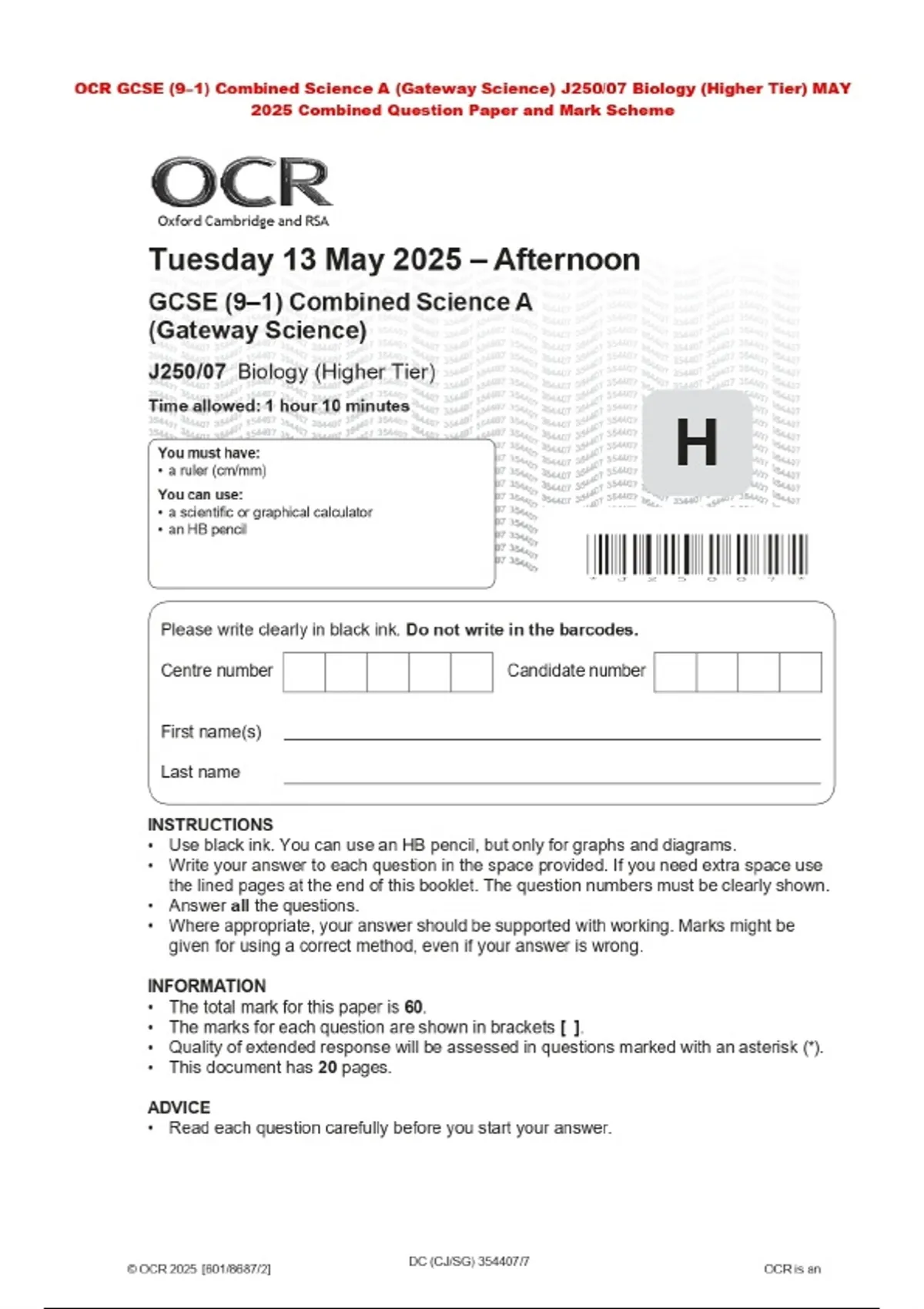OCR GCSE (9–1) Combined Science A (Gateway Science) J250/07 Biology (Higher Tier) MAY 2025 Combined Question Paper and Mark Scheme