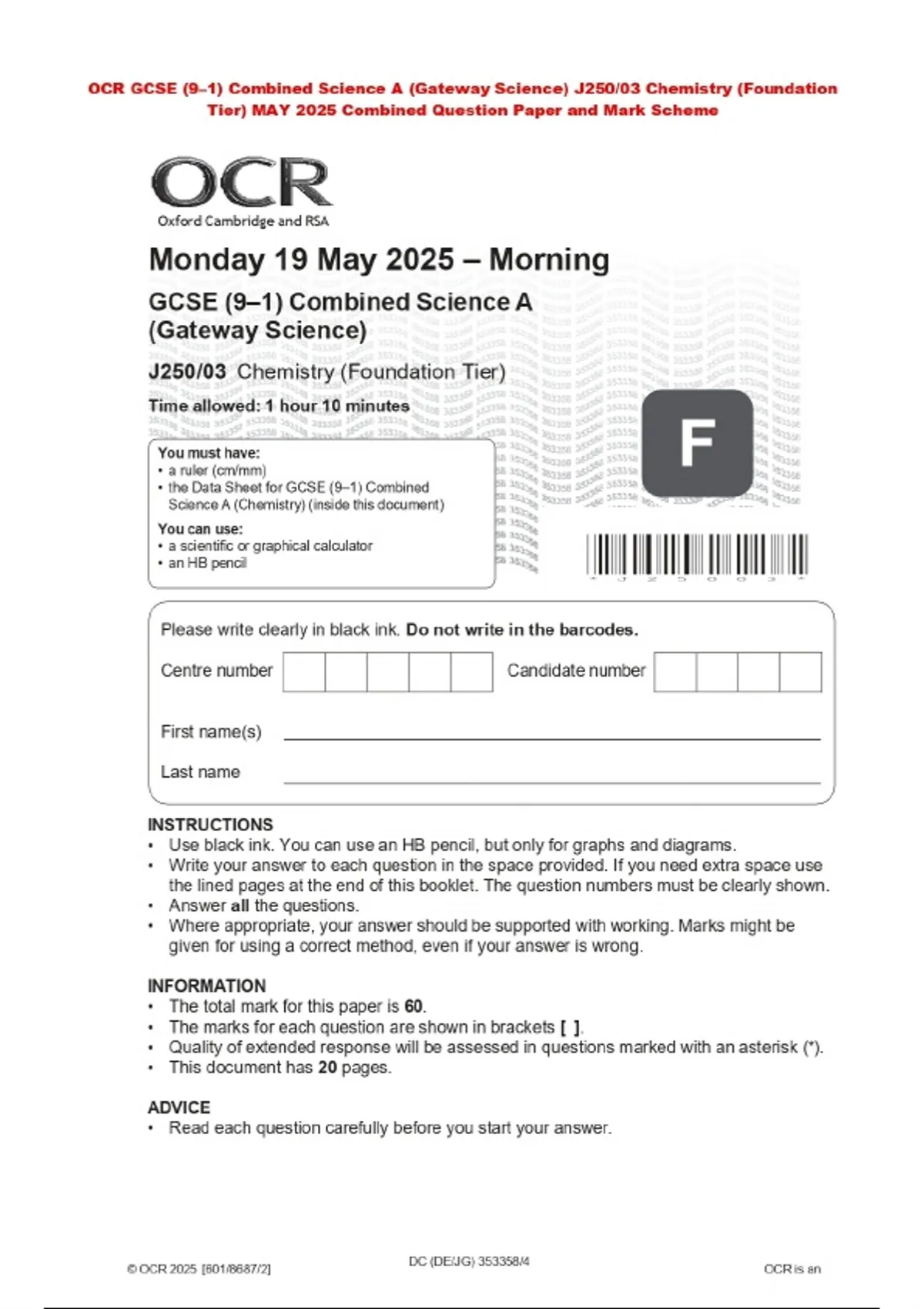 OCR GCSE (9–1) Combined Science A (Gateway Science) J250/03 Chemistry (Foundation Tier) MAY 2025 Combined Question Paper and Mark Scheme
