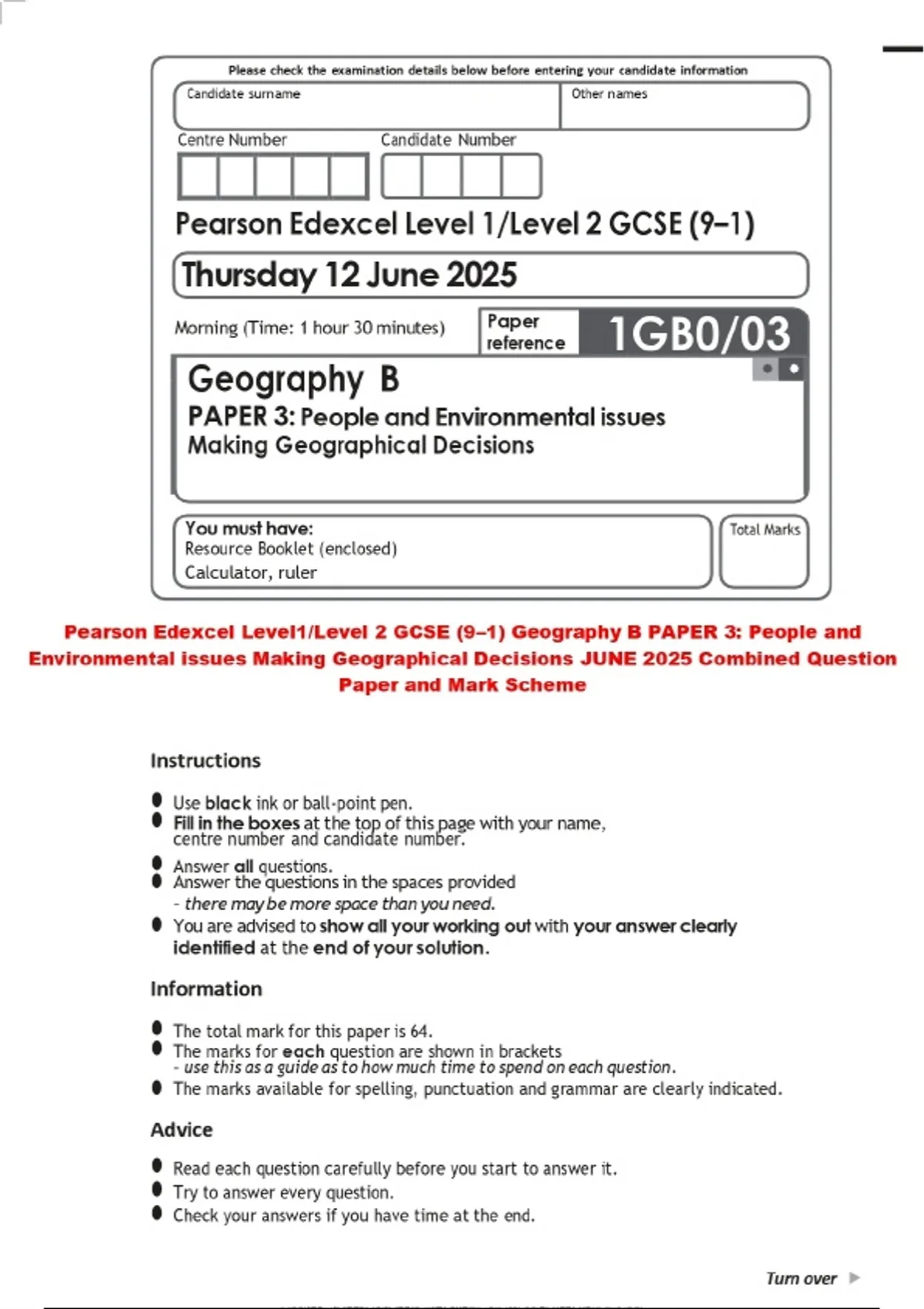Pearson Edexcel Level1/Level 2 GCSE (9–1) Geography B PAPER 3: People and Environmental issues Making Geographical Decisions JUNE 2025 Combined Question Paper and Mark Scheme