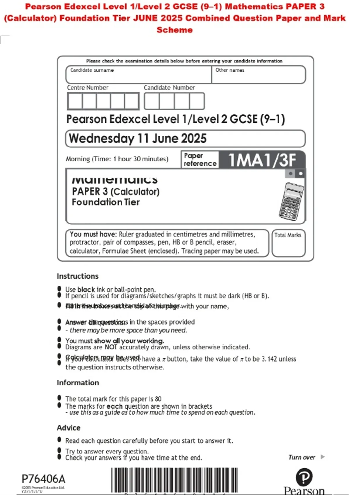 Pearson Edexcel Level 1/Level 2 GCSE (9–1) Mathematics PAPER 3 (Calculator) Foundation Tier JUNE 2025 Combined Question Paper and Mark Scheme