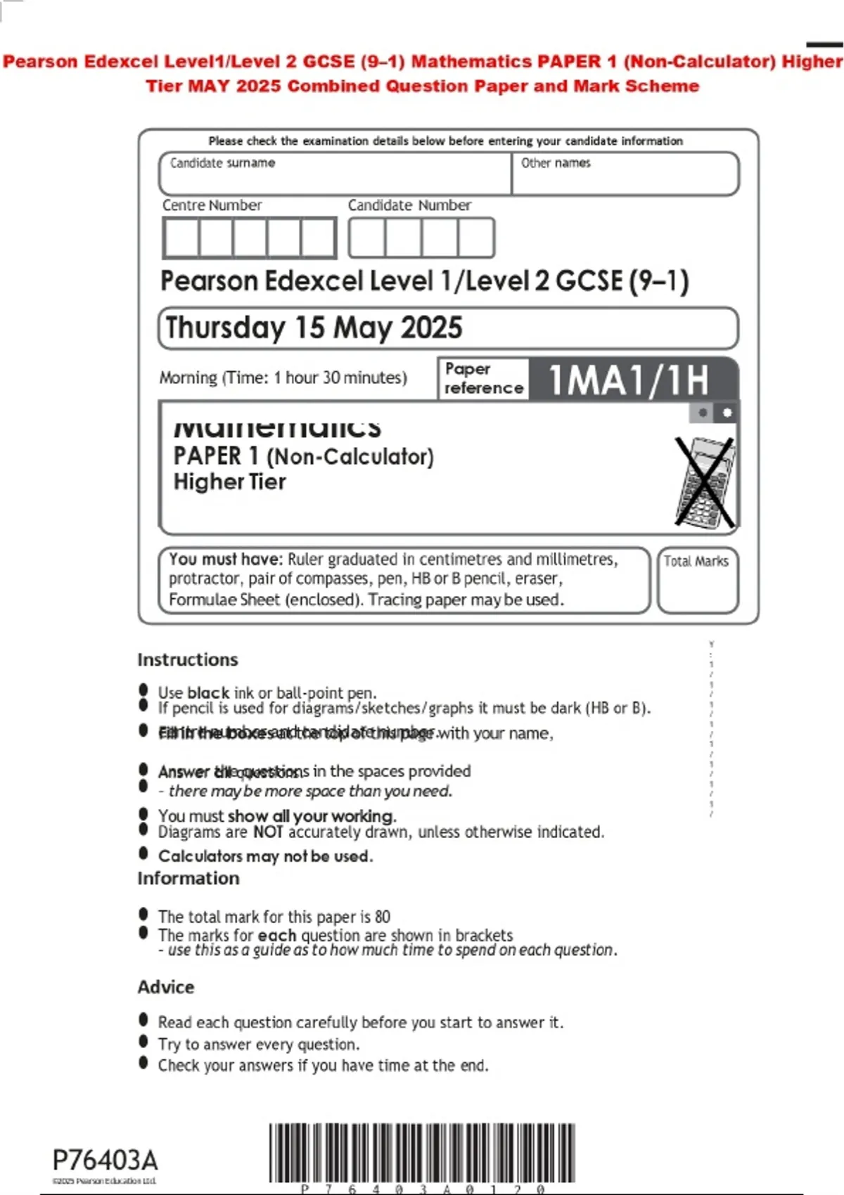 Pearson Edexcel Level1/Level 2 GCSE (9–1) Mathematics PAPER 1 (Non-Calculator) Higher Tier MAY 2025 Combined Question Paper and Mark Scheme
