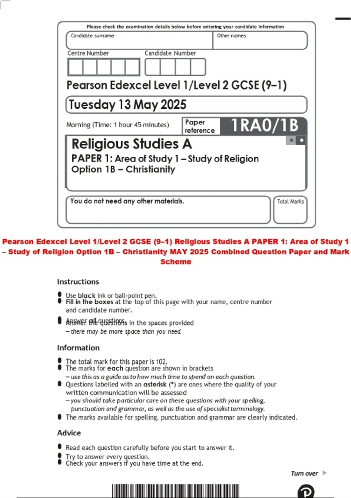 Pearson Edexcel Level 1/Level 2 GCSE (9–1) Religious Studies A PAPER 1: Area of Study 1 – Study of Religion Option 1B – Christianity MAY 2025 Combined Question Paper and Mark Scheme
