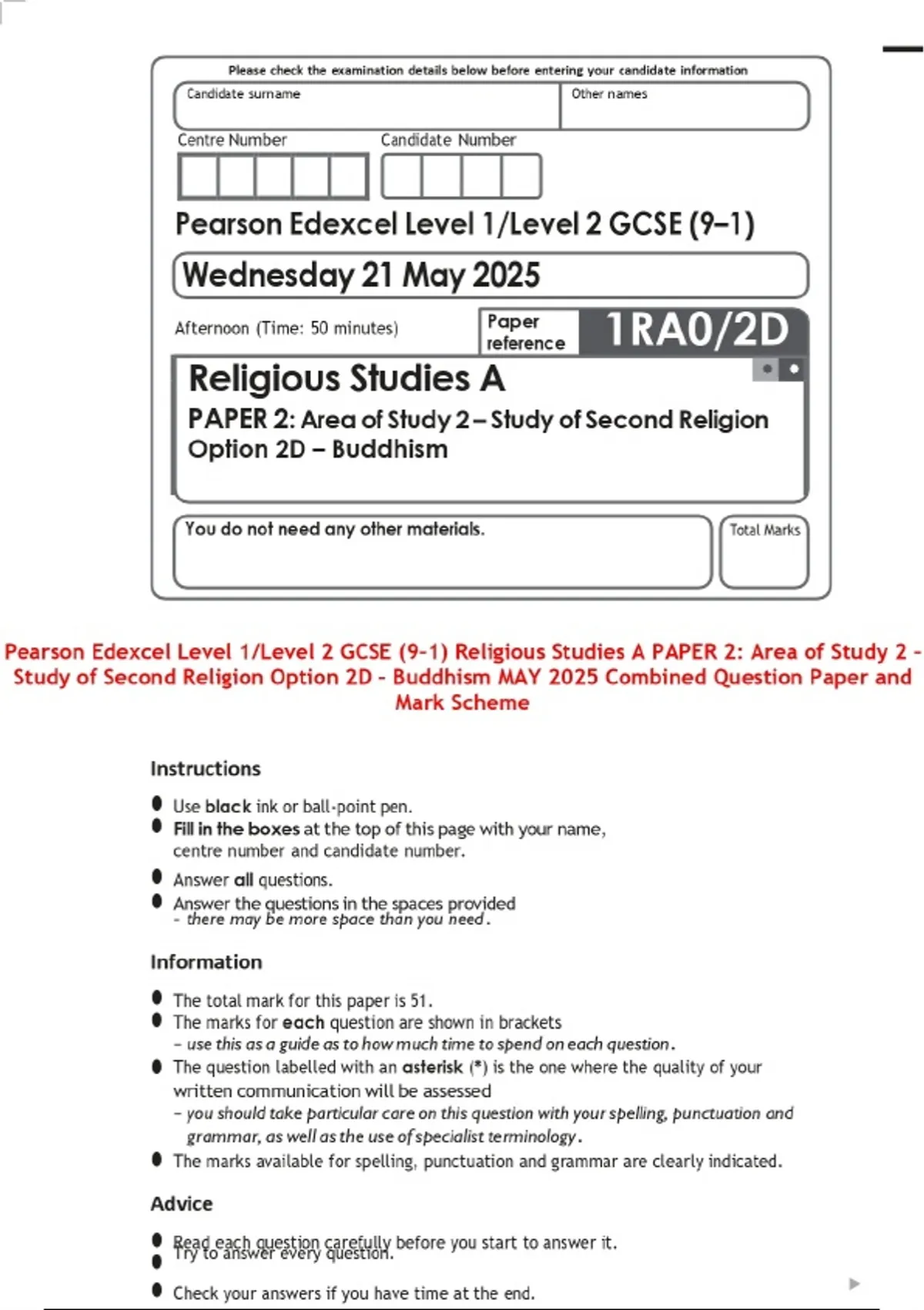 Pearson Edexcel Level 1/Level 2 GCSE (9–1) Religious Studies A PAPER 2: Area of Study 2 – Study of Second Religion Option 2D – Buddhism MAY 2025 Combined Question Paper and Mark Scheme