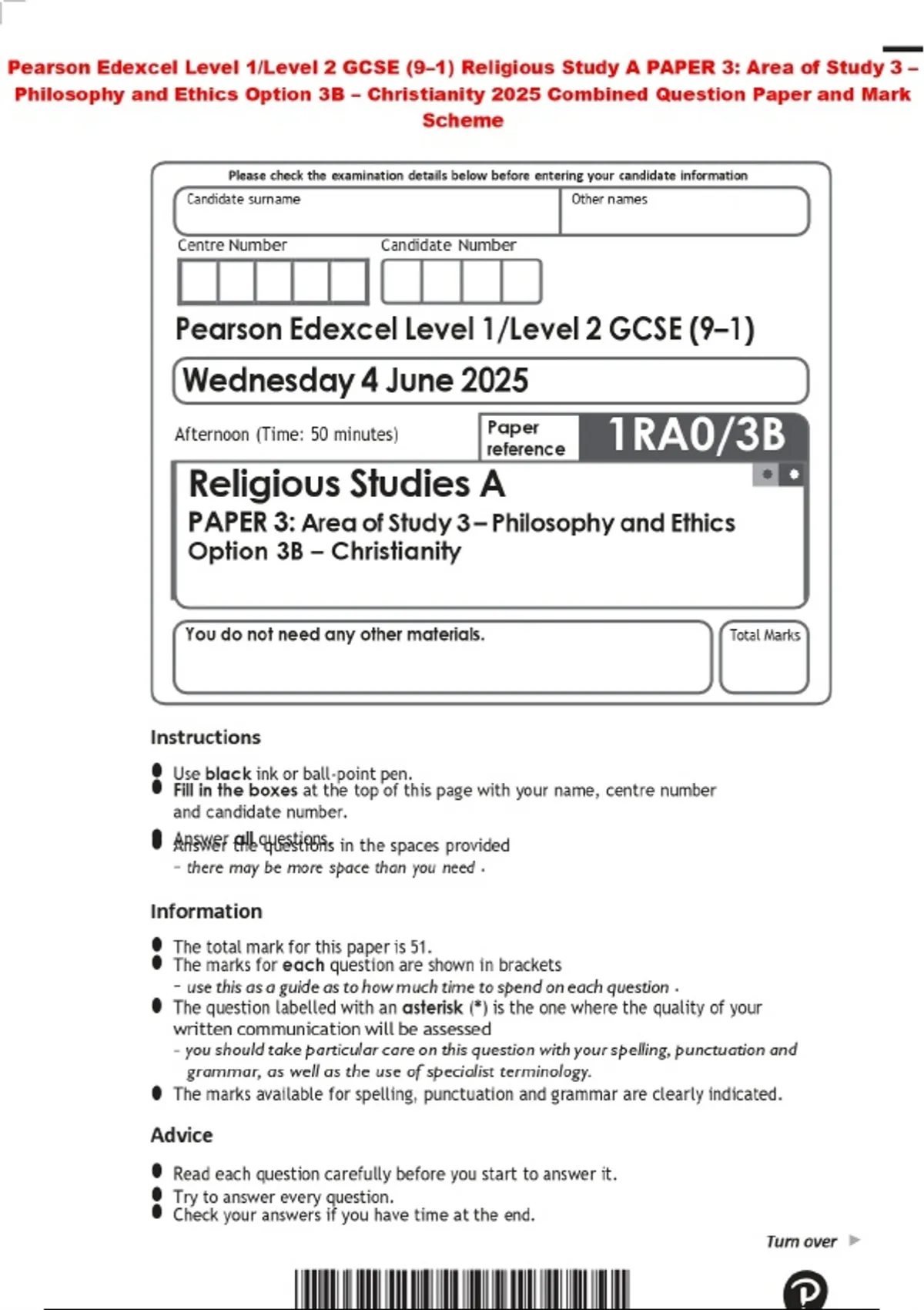 Pearson Edexcel Level 1/Level 2 GCSE (9–1) Religious Study A PAPER 3: Area of Study 3 – Philosophy and Ethics Option 3B – Christianity 2025 Combined Question Paper and Mark Scheme