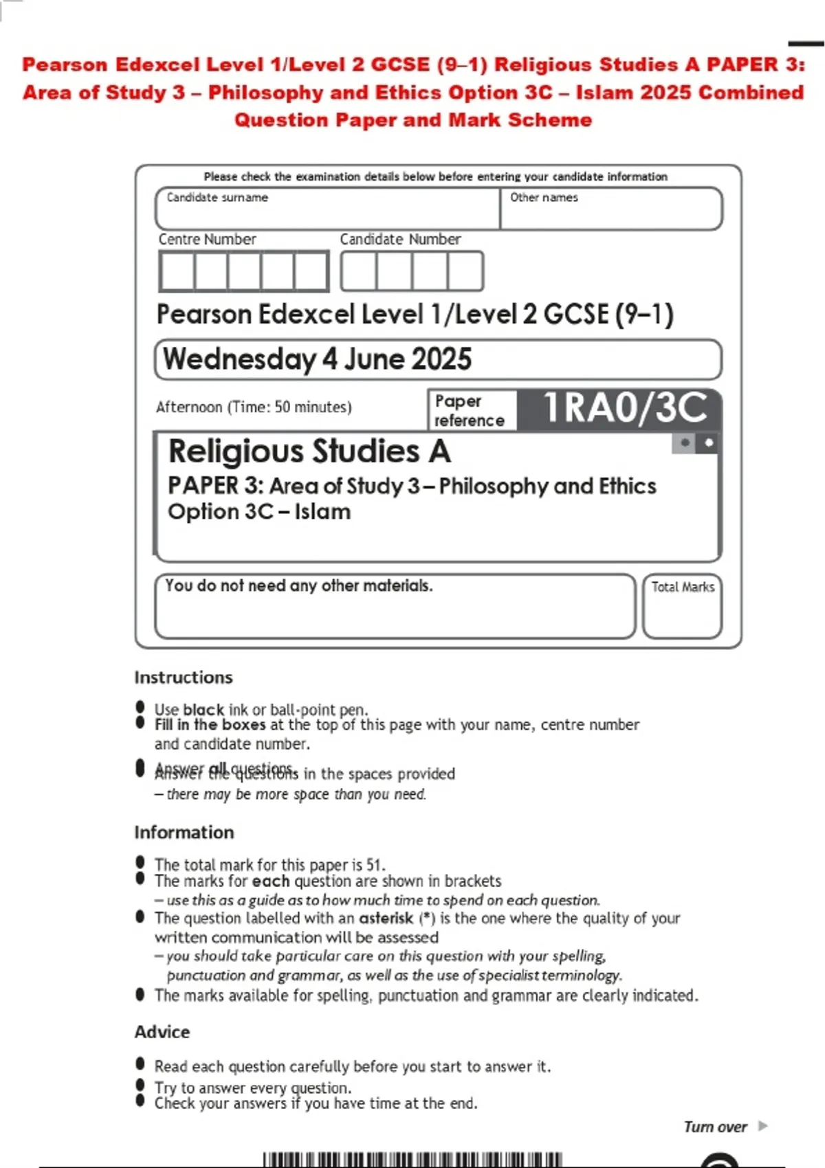 Pearson Edexcel Level 1/Level 2 GCSE (9–1) Religious Studies A PAPER 3: Area of Study 3 – Philosophy and Ethics Option 3C – Islam 2025 Combined Question Paper and Mark Scheme