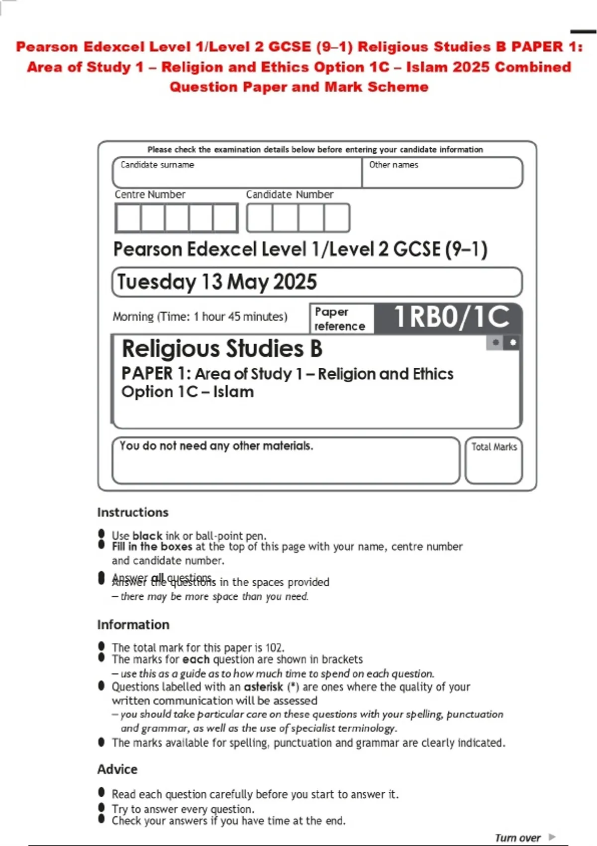 Pearson Edexcel Level 1/Level 2 GCSE (9–1) Religious Studies B PAPER 1: Area of Study 1 – Religion and Ethics Option 1C – Islam 2025 Combined Question Paper and Mark Scheme