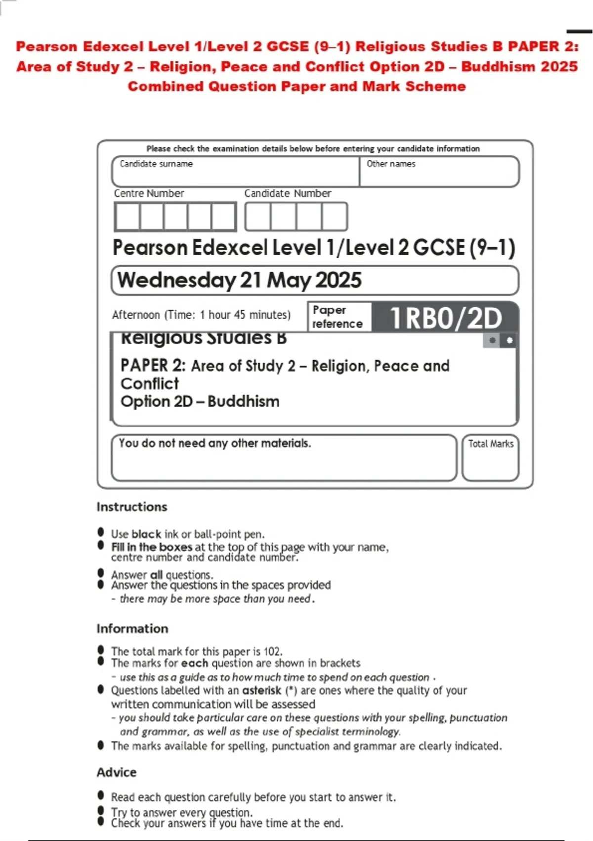 Pearson Edexcel Level 1/Level 2 GCSE (9–1) Religious Studies B PAPER 2: Area of Study 2 – Religion, Peace and Conflict Option 2D – Buddhism 2025 Combined Question Paper and Mark Scheme