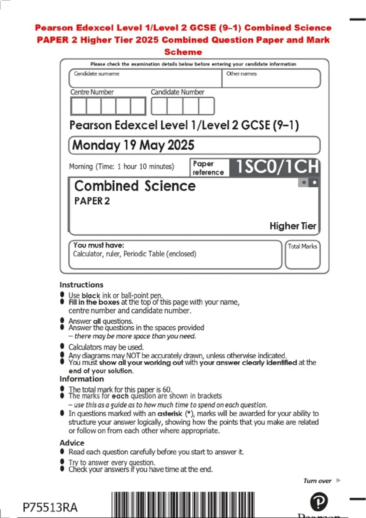 Pearson Edexcel Level 1/Level 2 GCSE (9–1) Combined Science PAPER 2 Higher Tier 2025 Combined Question Paper and Mark Scheme