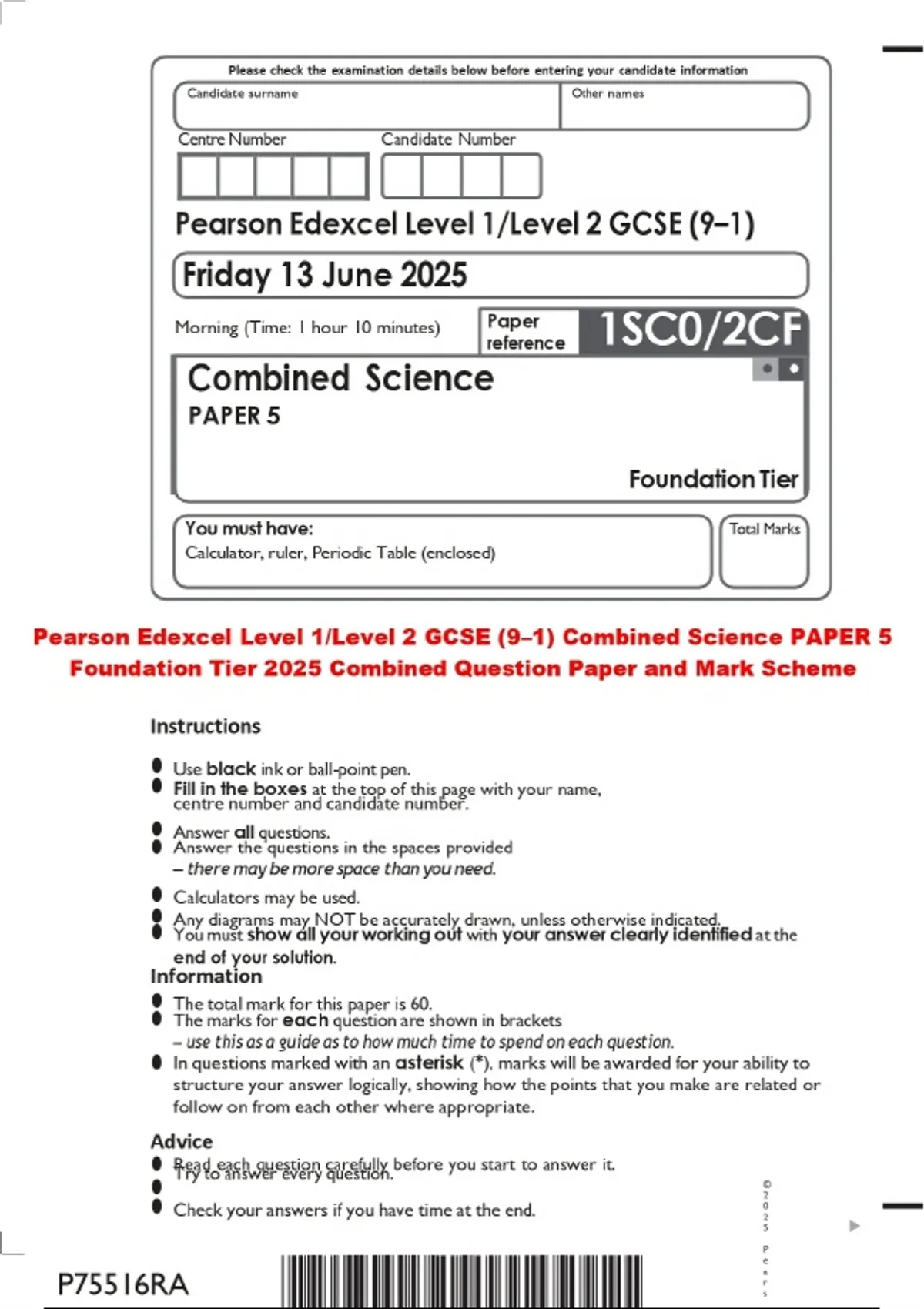 Pearson Edexcel Level 1/Level 2 GCSE (9–1) Combined Science PAPER 5 Foundation Tier 2025 Combined Question Paper and Mark Scheme