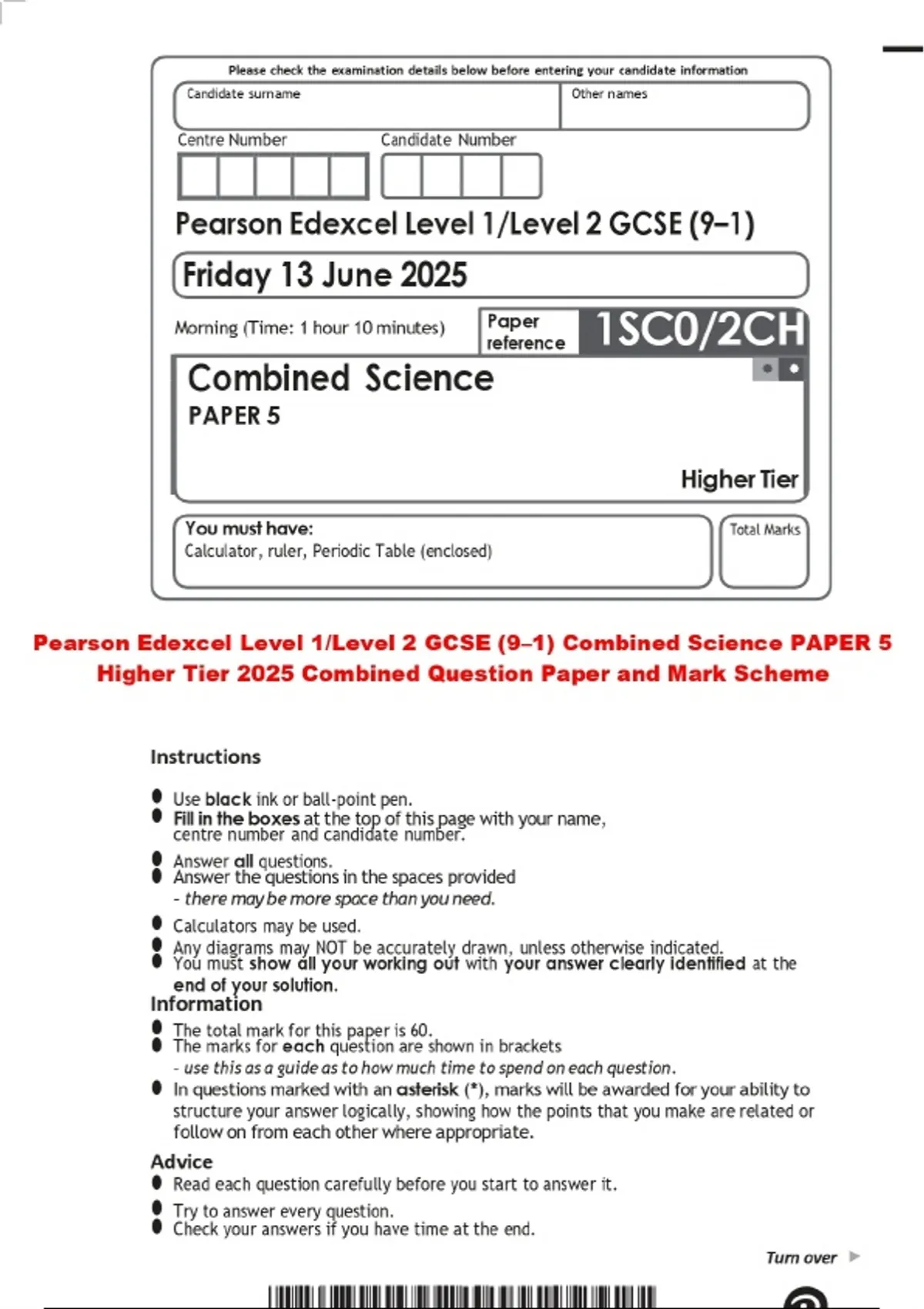 Pearson Edexcel Level 1/Level 2 GCSE (9–1) Combined Science PAPER 5 Higher Tier 2025 Combined Question Paper and Mark Scheme