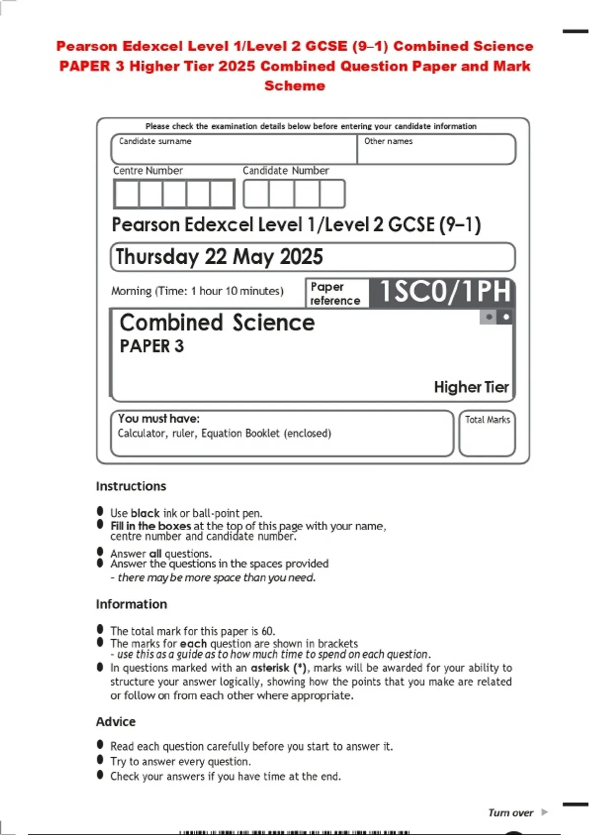 Pearson Edexcel Level 1/Level 2 GCSE (9–1) Combined Science PAPER 3 Higher Tier 2025 Combined Question Paper and Mark Scheme