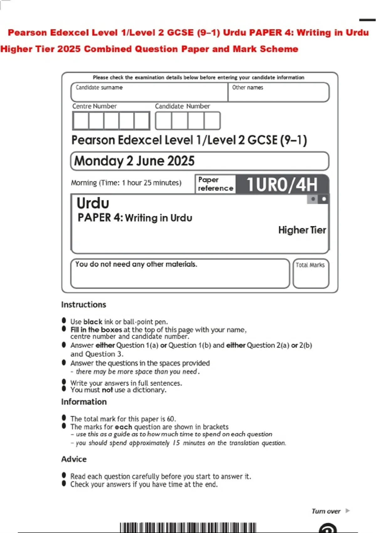 Pearson Edexcel Level 1/Level 2 GCSE (9–1) Urdu PAPER 4: Writing in Urdu Higher Tier 2025 Combined Question Paper and Mark Scheme