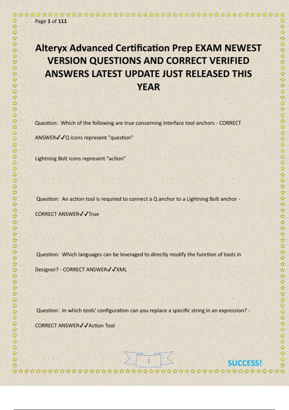 Alteryx Advanced Certification Prep Exam – Newest Version with Correct Verified Answers is a comprehensive study guide designed to help candidates prepare confidently for the Alteryx Advanced Certification, aligned with the latest exam updates released this year. It covers the advanced concepts and skills tested on the exam, including complex data preparation and blending, advanced transformations, macros, batch and iterative processing, performance optimization, analytic applications, predictive tools, spatial analytics, and workflow troubleshooting. The exam-style questions reflect real certification scenarios, helping users apply advanced techniques, refine problem-solving skills, and understand best practices within Alteryx Designer. Whether you are upgrading from the Core certification or aiming to validate advanced expertise, this guide supports focused preparation and builds confidence for success on the Alteryx Advanced Certification exam.