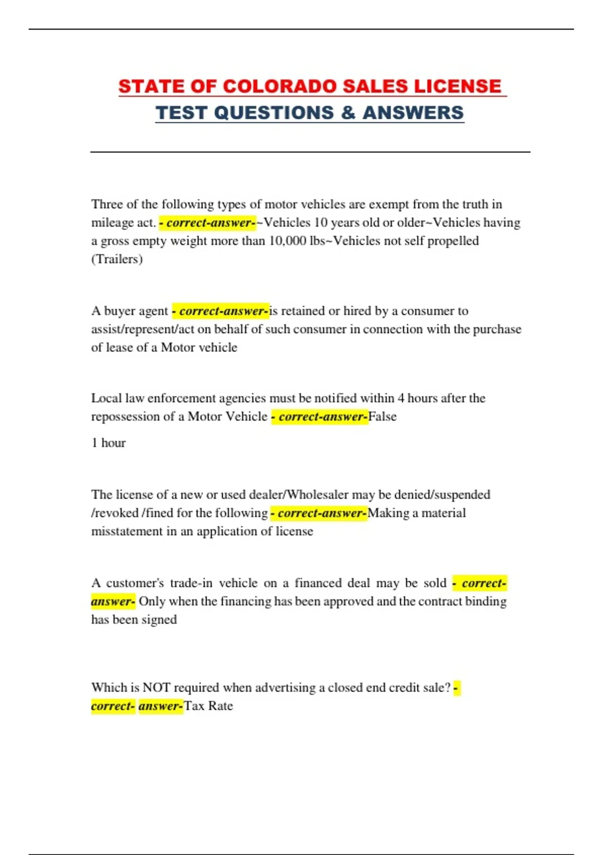 State of Colorado Sales License Test – Questions and Answers | Colorado Motor Vehicle Dealer & Salesperson Exam Preparation