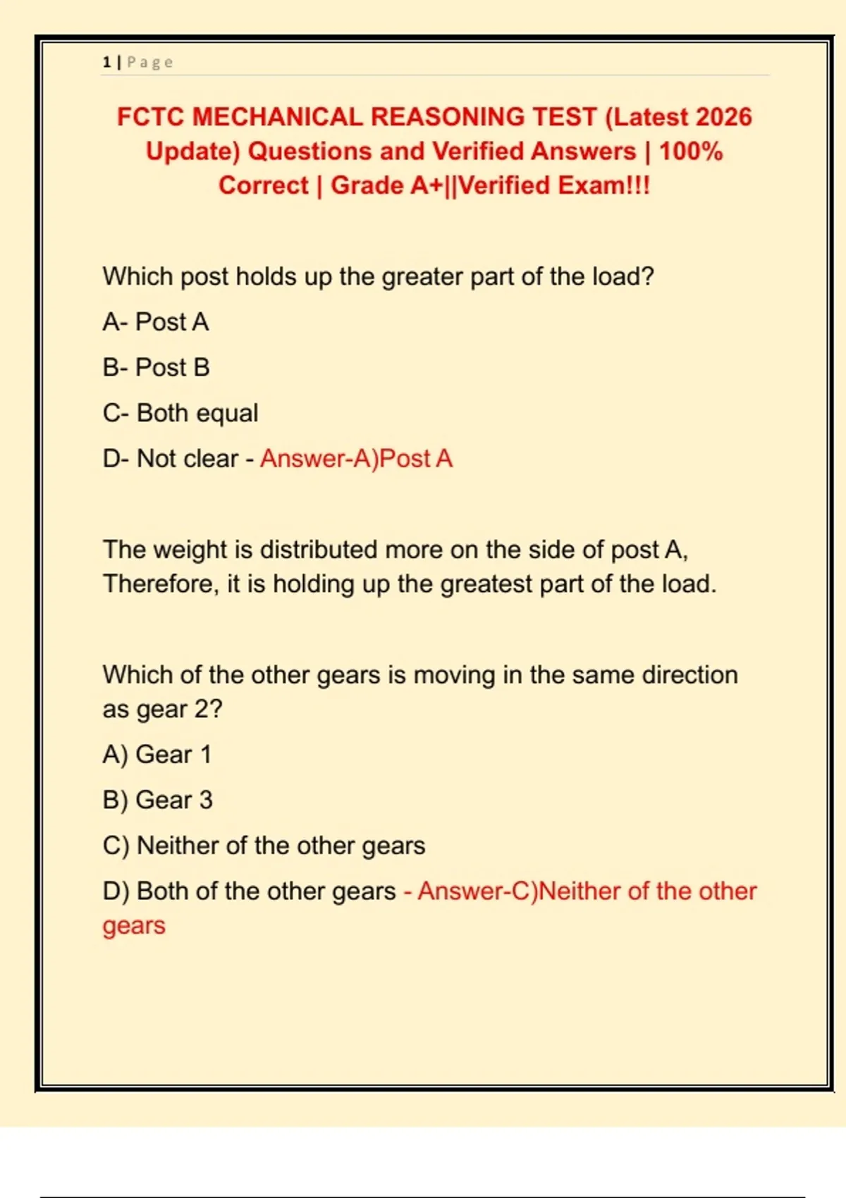 FCTC MECHANICAL REASONING TEST (Latest 2026 Update) Questions and Verified Answers | 100% Correct | Grade A+||Verified Exam!!!