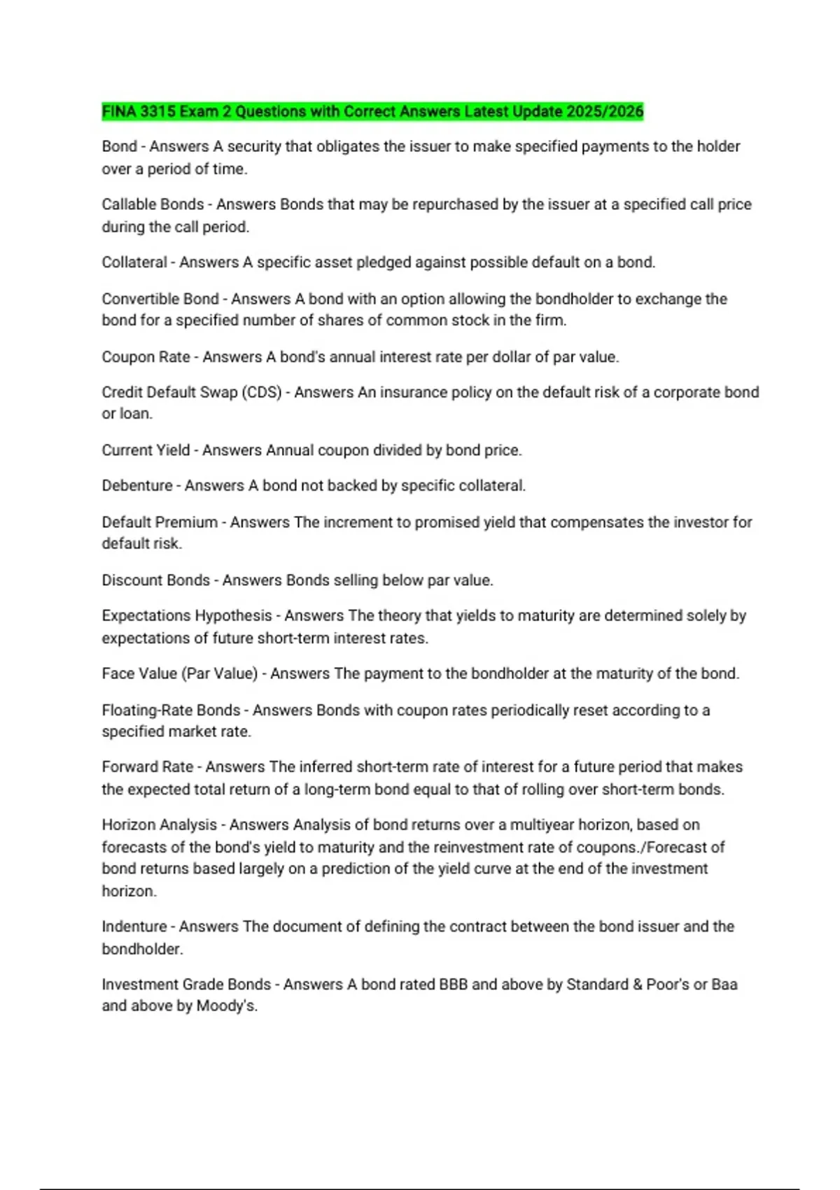 Face Value (Par Value) - Answers The payment to the bondholder at the maturity of the bond.