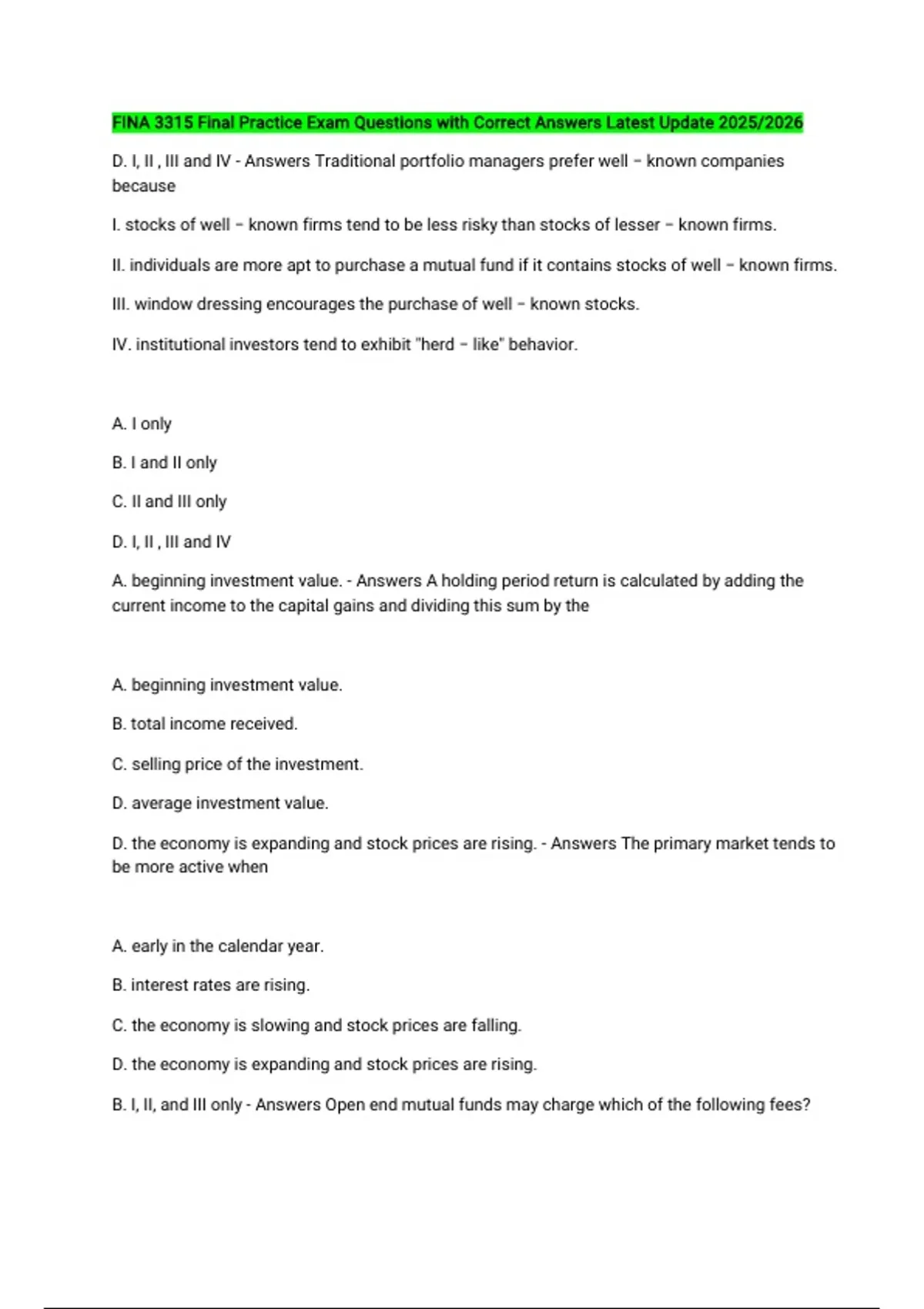 D. I, II , III and IV - Answers Traditional portfolio managers prefer well − known companies