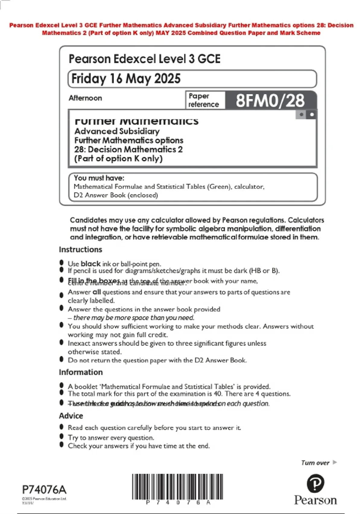 Pearson Edexcel Level 3 GCE Further Mathematics Advanced Subsidiary Further Mathematics options 28: Decision Mathematics 2 (Part of option K only) MAY 2025 Combined Question Paper and Mark Scheme
