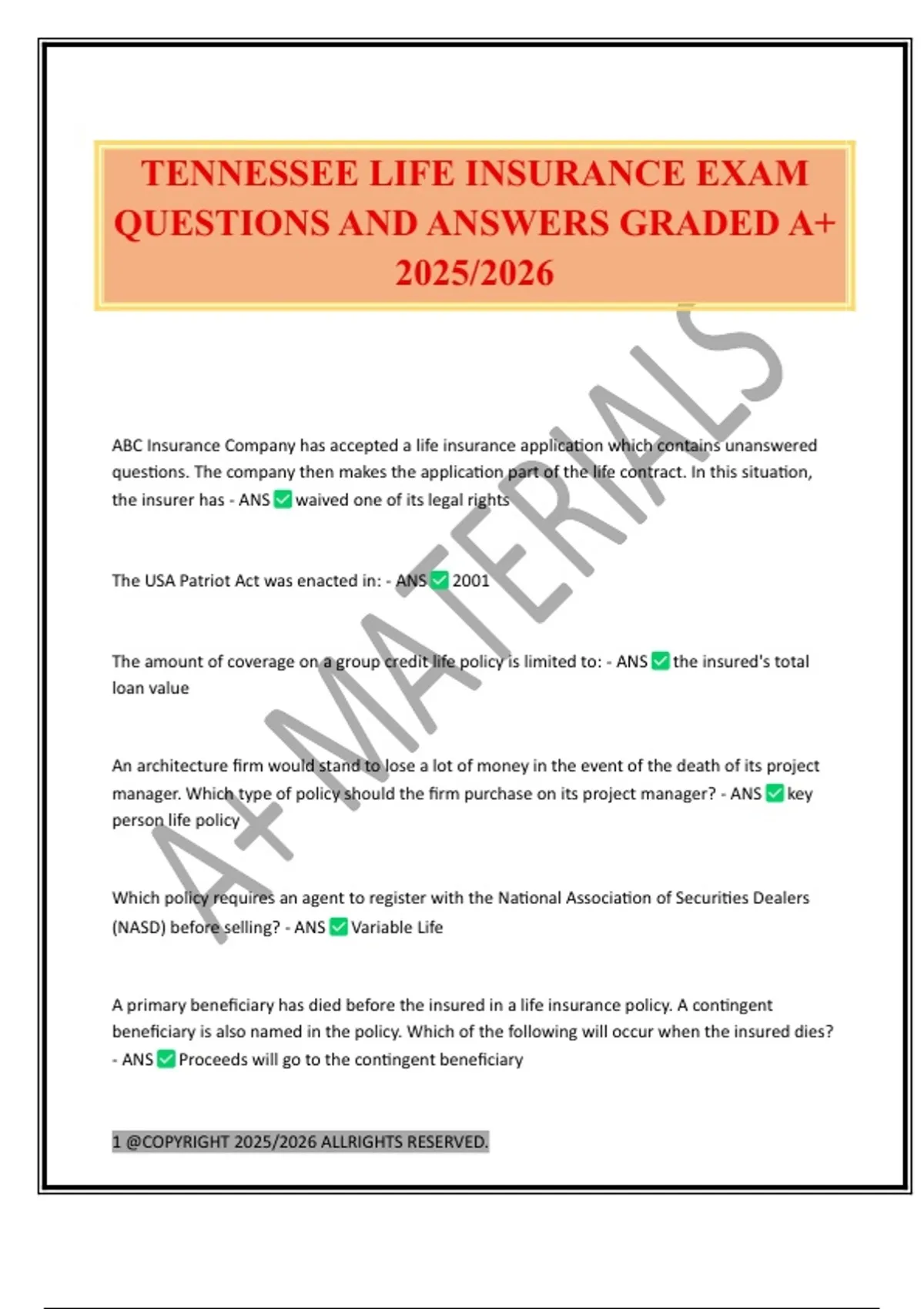 TENNESSEE LIFE INSURANCE EXAM