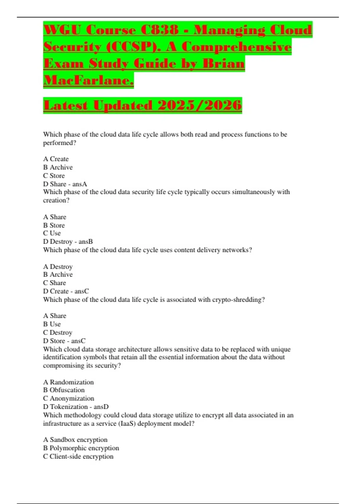 WGU Course C838 - Managing Cloud Security (CCSP). A Comprehensive Exam Study Guide by Brian MacFarlane. Latest Updated 2025/2026