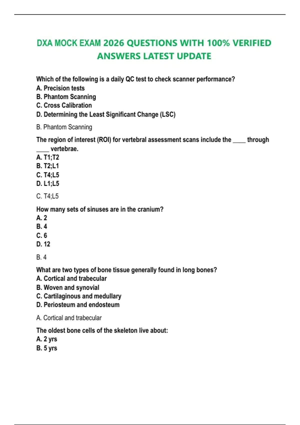 DXA (Dual-Energy X-ray Absorptiometry) Comprehensive Exam – 200 Questions with Answers and Short Rationales (2026/2027) Overview: This comprehensive exam guide is designed for students, radiology technologists, and healthcare professionals studying DXA (Dual-Energy X-ray Absorptiometry). It covers all critical areas of DXA practice, including physics, positioning, scanning techniques, artifacts, quality control, BMD interpretation, and body composition analysis. The 200 questions are divided into six sections: 1. DXA Physics & Principles (1–30): Covers energy types, beam technology, and fundamental physics concepts. 2. Positioning & Scanning Protocols (31–60): Focuses on proper patient positioning, ROI selection, and scan protocols. 3. Artifacts & Errors (61–90): Identifies common scan artifacts, errors, and methods to minimize them. 4. Quality Control & Calibration (91–120): Addresses QC procedures, phantom use, LSC, and machine drift. 5. BMD Interpretation (121–150): Includes T-score, Z-score, osteoporosis diagnosis, and fracture risk assessment. 6. Body Composition & Total Body DXA (151–200): Discusses fat mass, lean mass, appendicular lean mass, sarcopenia, and regional fat assessment. Each question includes the correct answer in bold and a rationale, making this an ideal resource for exam preparation, review, and self-assessment.