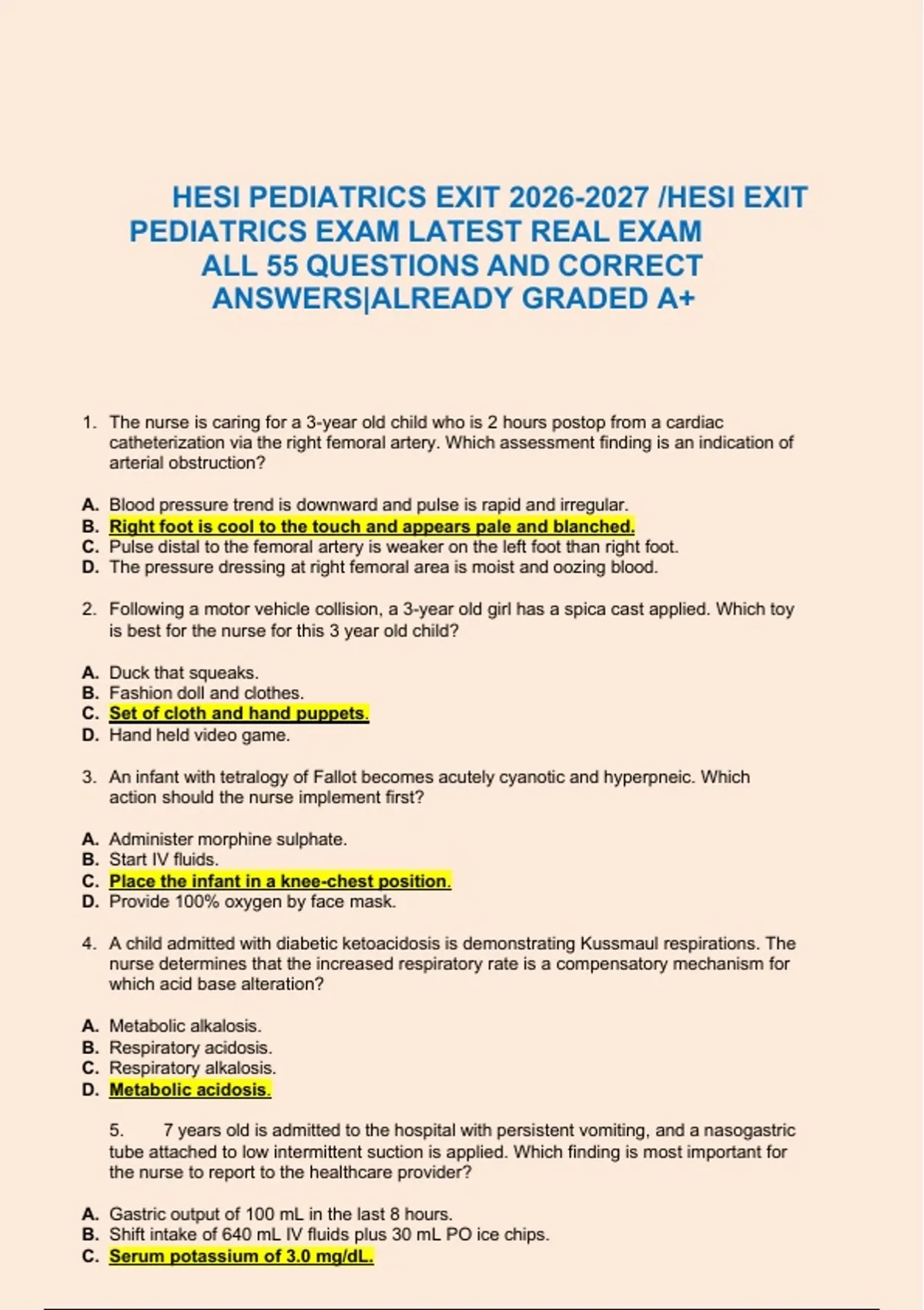 HESI PEDIATRICS EXIT /HESI EXIT PEDIATRICS EXAM LATEST REAL EXAM ALL 55 QUESTIONS AND CORRECT ANSWERS|ALREADY GRADED A+