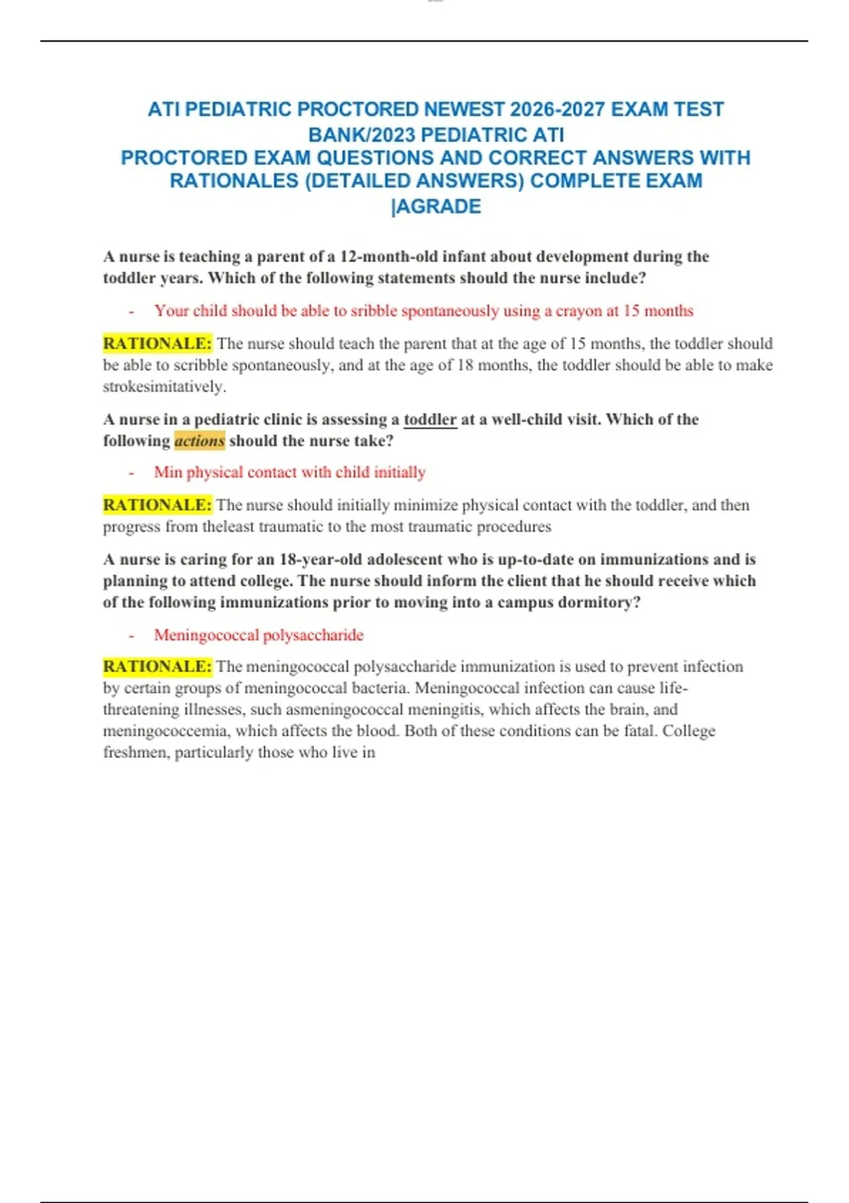 ATI PEDIATRIC PROCTORED NEWEST 2026-2027 EXAM TEST