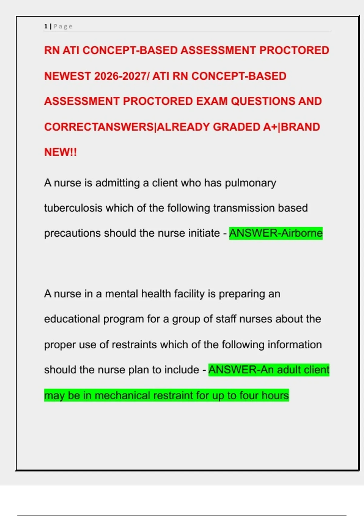 RN ATI CONCEPT-BASED ASSESSMENT PROCTORED NEWEST / ATI RN CONCEPT-BASED ASSESSMENT PROCTORED EXAM QUESTIONS AND CORRECTANSWERS|ALREADY GRADED A+|BRAND NEW!!