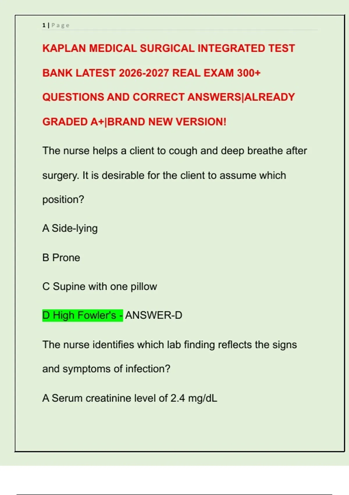 KAPLAN MEDICAL SURGICAL INTEGRATED TEST BANK LATEST REAL EXAM 300+ QUESTIONS AND CORRECT ANSWERS|ALREADY GRADED A+|BRAND NEW VERSION!