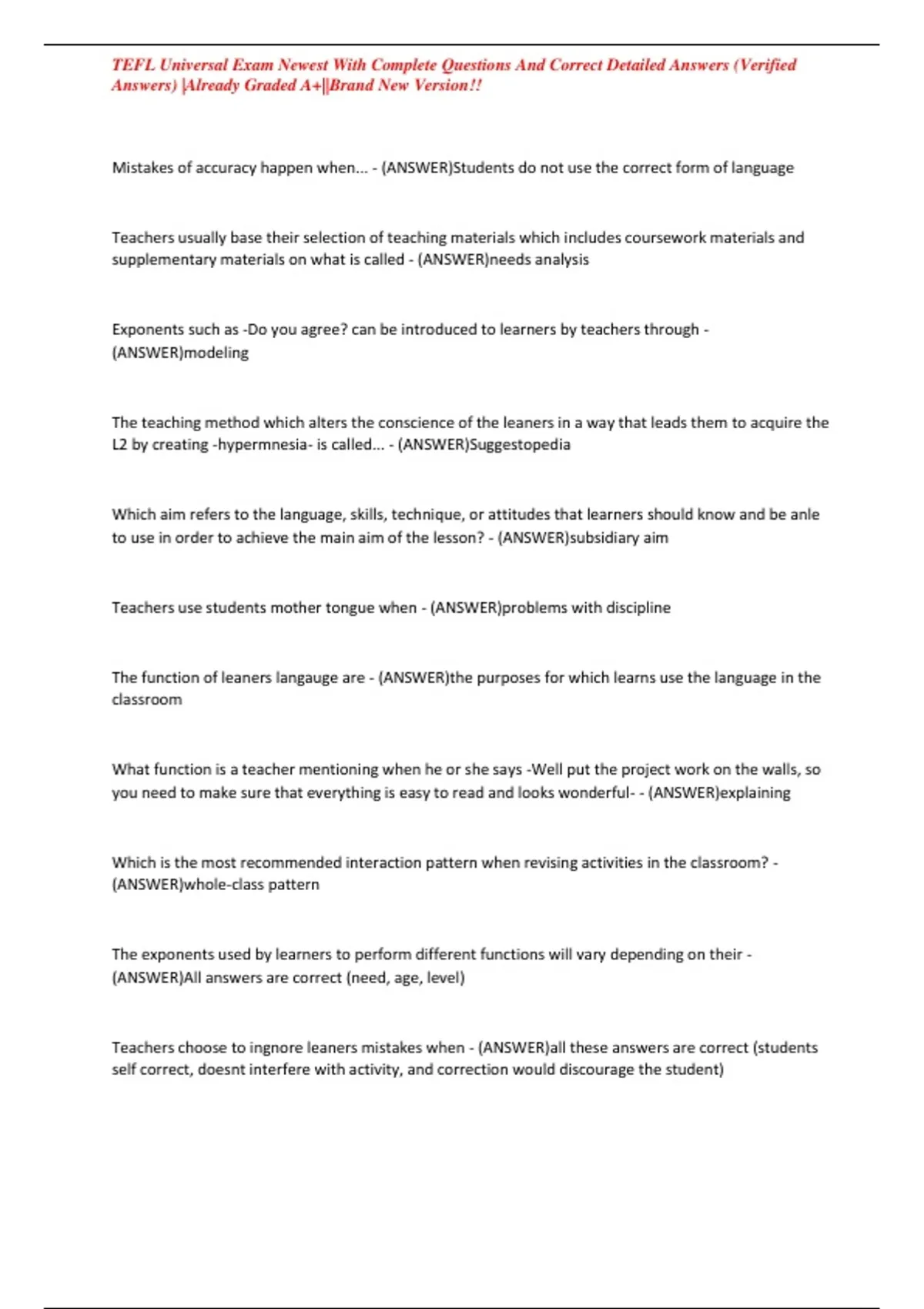 TEFL Universal Exam Newest With Complete Questions And Correct Detailed Answers (Verified