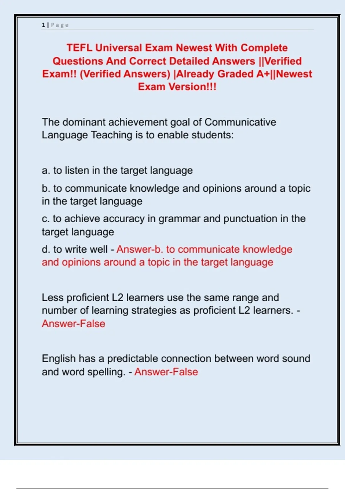 TEFL Universal Exam Newest With Complete Questions And Correct Detailed Answers ||Verified Exam!! (Verified Answers) |Already Graded A+||Newest Exam Version!!!