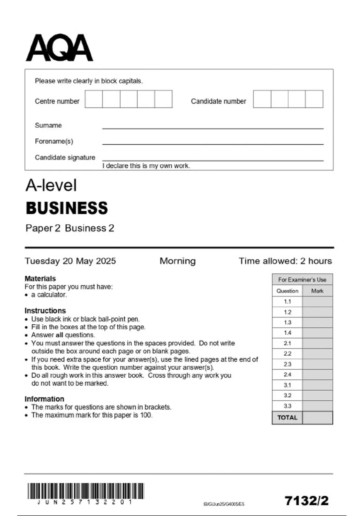 ACTUAL 2025 AQA A-LEVEL BUSINESS 7132/2 PAPER 2 MERGED QUESTION PAPER AND MARK SCHEME
