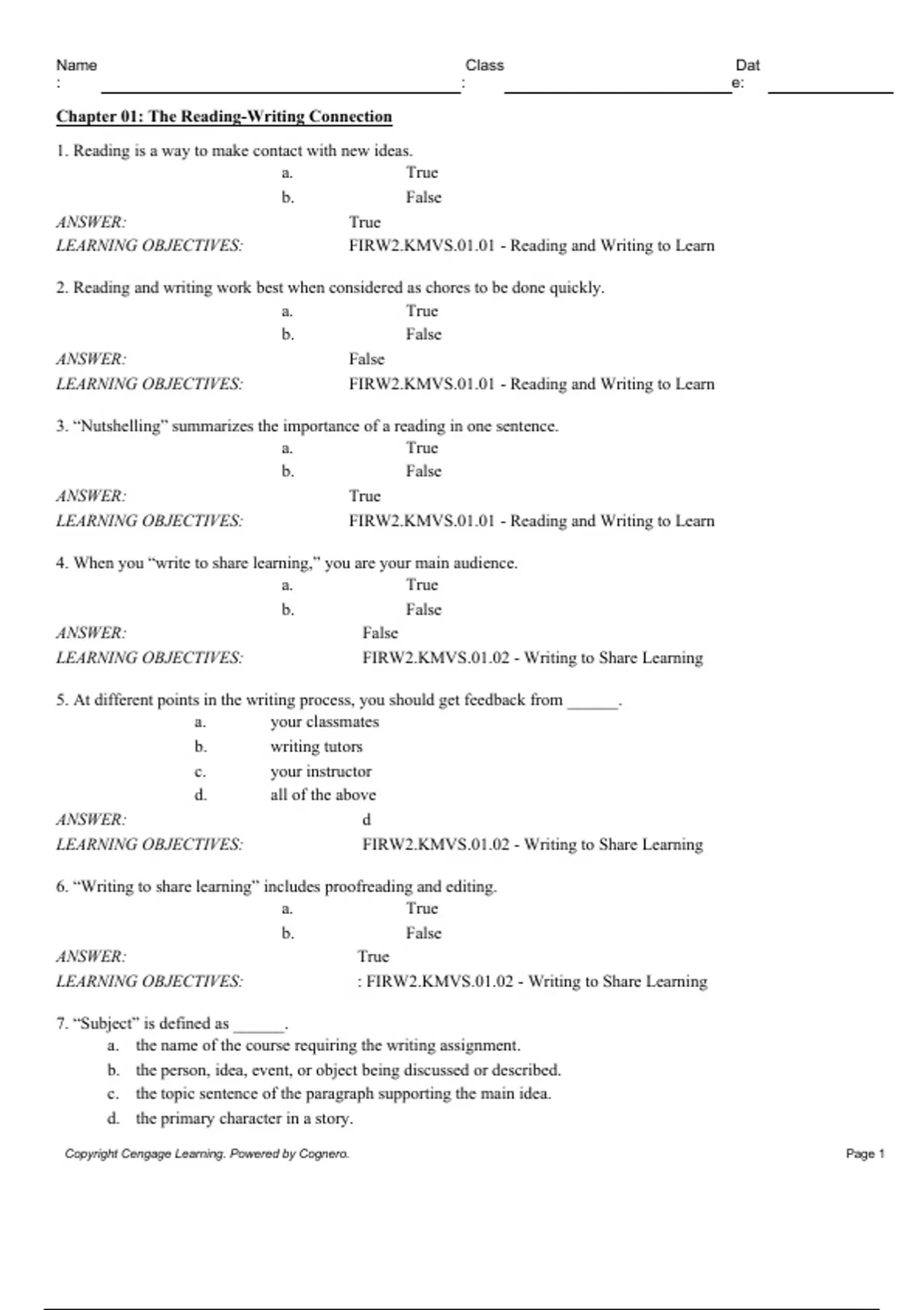 Copyright Cengage Learning. Powered by Cognero. Page 1