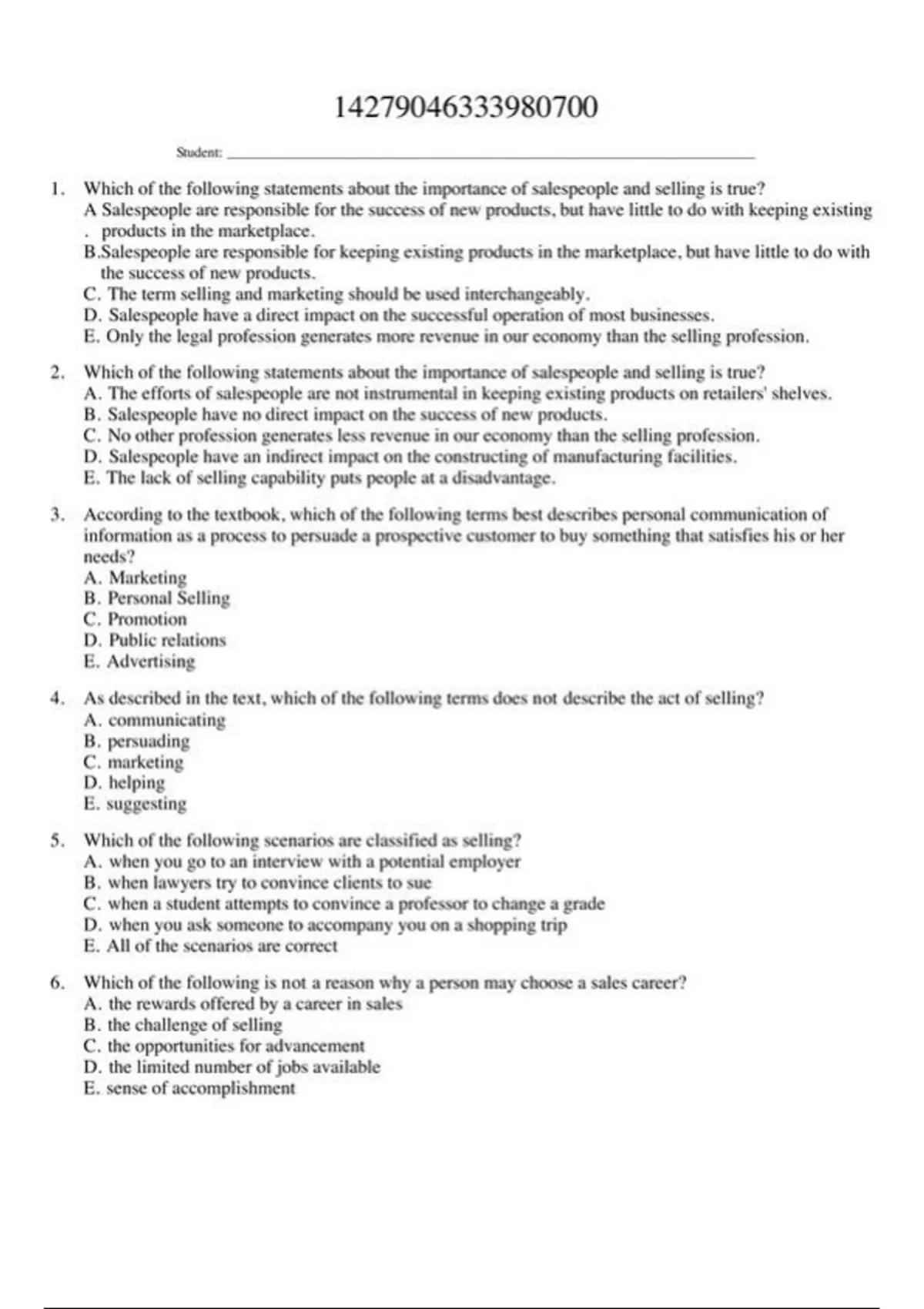 Title: Futrell - ABCs of Relationship Selling Through Service - 6th CANADIAN author: edition: N/A resource: test bank This test bank is designed to help students approach exams in Futrell - ABCs of Relationship Selling Through Service - 6th CANADIAN with confidence. It focuses on the way instructors evaluate understanding, emphasizing applied reasoning and accurate choices under exam conditions. By practicing structured questions, students strengthen recall, improve time management, and reduce uncertainty during quizzes and final exams. The material reveals weak topics early, supports efficient revision, and lowers exam-related stress. Regular use contributes to passing the course and achieving stronger academic results. NOTE: If you are looking for bigger sample, different edition, or another test bank/ solutions manual, just PM me. #examprep #finalexam #coursereview #studyhelp #testpractice