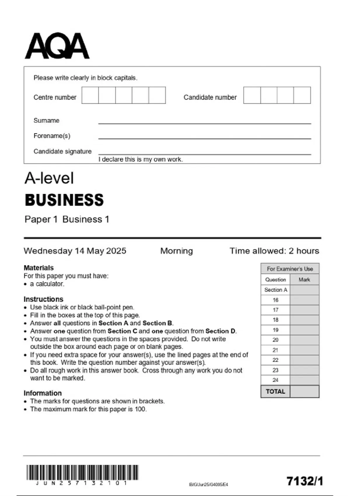 AQA A level Business 7132/1 Paper 1 2025 Merged Question Paper and Mark Scheme