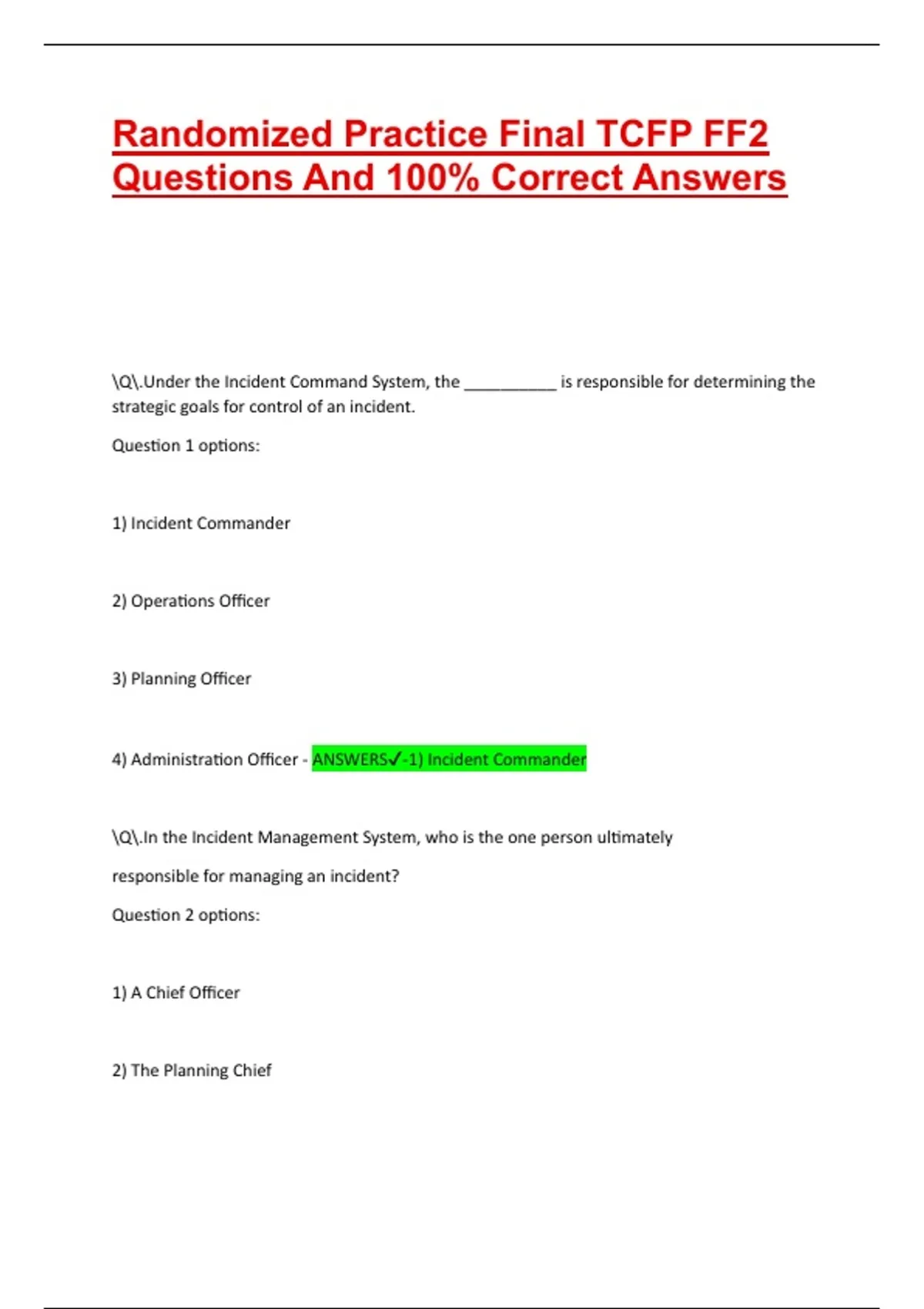 4) Administration Officer - ANSWERS✔-1) Incident Commander