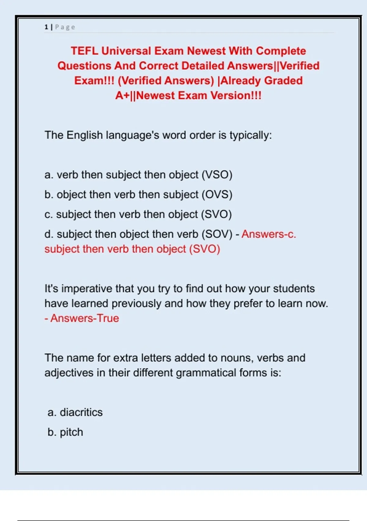 TEFL Universal Exam Newest With Complete Questions And Correct Detailed Answers||Verified Exam!!! (Verified Answers) |Already Graded A+||Newest Exam Version!!!