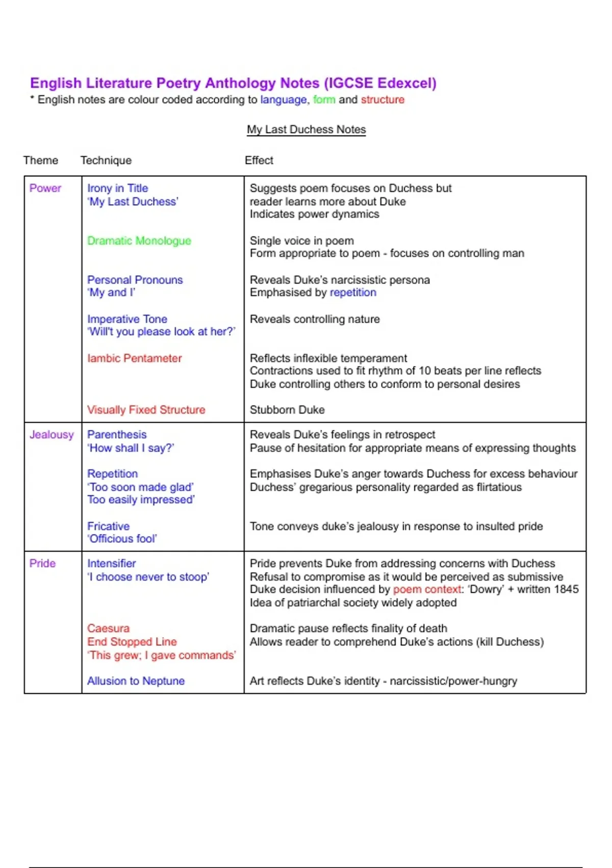 English Literature Poetry Anthology Notes (IGCSE Edexcel)