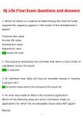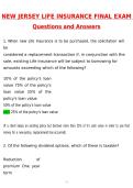 NJ Life Insurance Exam Latest 2026 | Questions with 100% Correct Answers Complete | Updated 2026 / 2027 Verified by Experts NJ Life Insurance Exam Complete Prep Guide (2026 / 2027) is a comprehensive, exam-focused resource designed for students preparing for the New Jersey Life Insurance Producer Exam, NJ Life Insurance Final Exam, and NJ Life Insurance and Laws Producer Exam. Built specifically for licensing candidates, this guide includes actual 2026 exam-style questions with verified correct ...