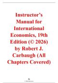 International Economics, 19th Edition – Robert J. Carbaugh – ISBN 9798214041605 – Instructor’s Manual (All Chapters 1–15). Chapters Include: Chapter 1 The International Economy and Globalization, Chapter 2 Foundations of Modern Trade Theory: Comparative Advantage, Chapter 3 Sources of Comparative Advantage, Chapter 4 Tariffs, Chapter 5 Nontariff Trade Barriers, Chapter 6 Trade Regulations and Industrial Policies, Chapter 7 Trade Policies for the Developing Nations, Chapter 8 Regional T...