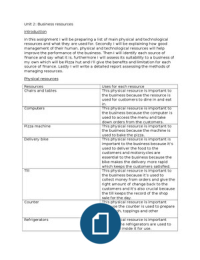 Business UNIT 2 P3: Describe the main physical and technological resources required in the operation of a selected organisation (2ND YEAR)