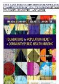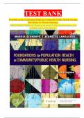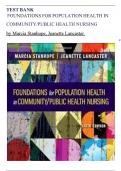 - This document contains the complete test bank for all chapters of Foundations for Population Health in Community/Public Health Nursing, 6th Edition by Marcia Stanhope and Jeanette Lancaster. It includes updated, high-quality questions with A+ graded answers covering all core topics in community and public health nursing. Content areas include population health concepts, epidemiology, health promotion, disease prevention, community assessment, policy, and professional nursing roles. The material ...
