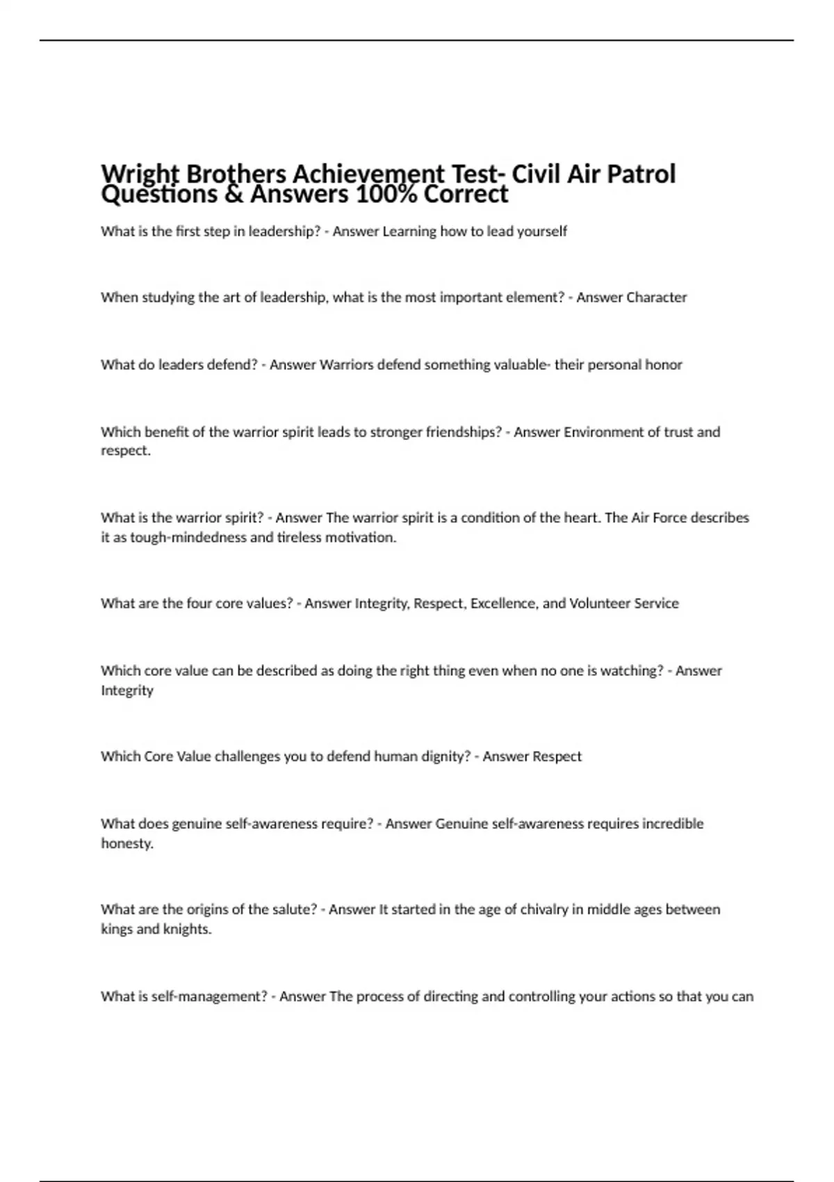 Wright Brothers Achievement Test- Civil Air Patrol Questions, CAP Wright Brothers Achievement Test, Civil Air Patrol Wright Brothers Exam, Civil Air Patrol Wright Brother Exam Already Solved 100%, Leadership Test Study Guide, Civil Air Patrol Wright Brothers Test, CAP Learn To Lead Chapters 1-3, Civil Air Patrol Wright Brothers Test Graded A+