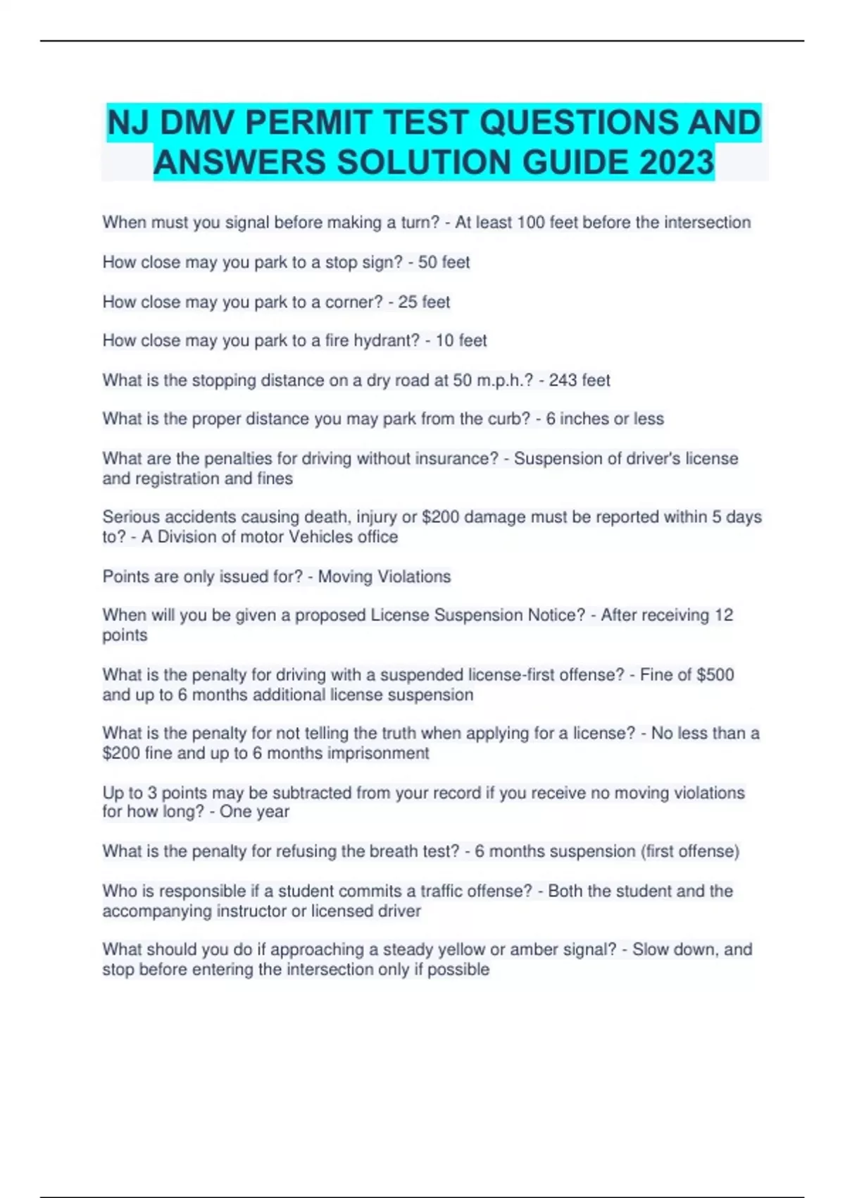 NJ DMV PERMIT TEST QUESTIONS AND ANSWERS SOLUTION GUIDE 2023