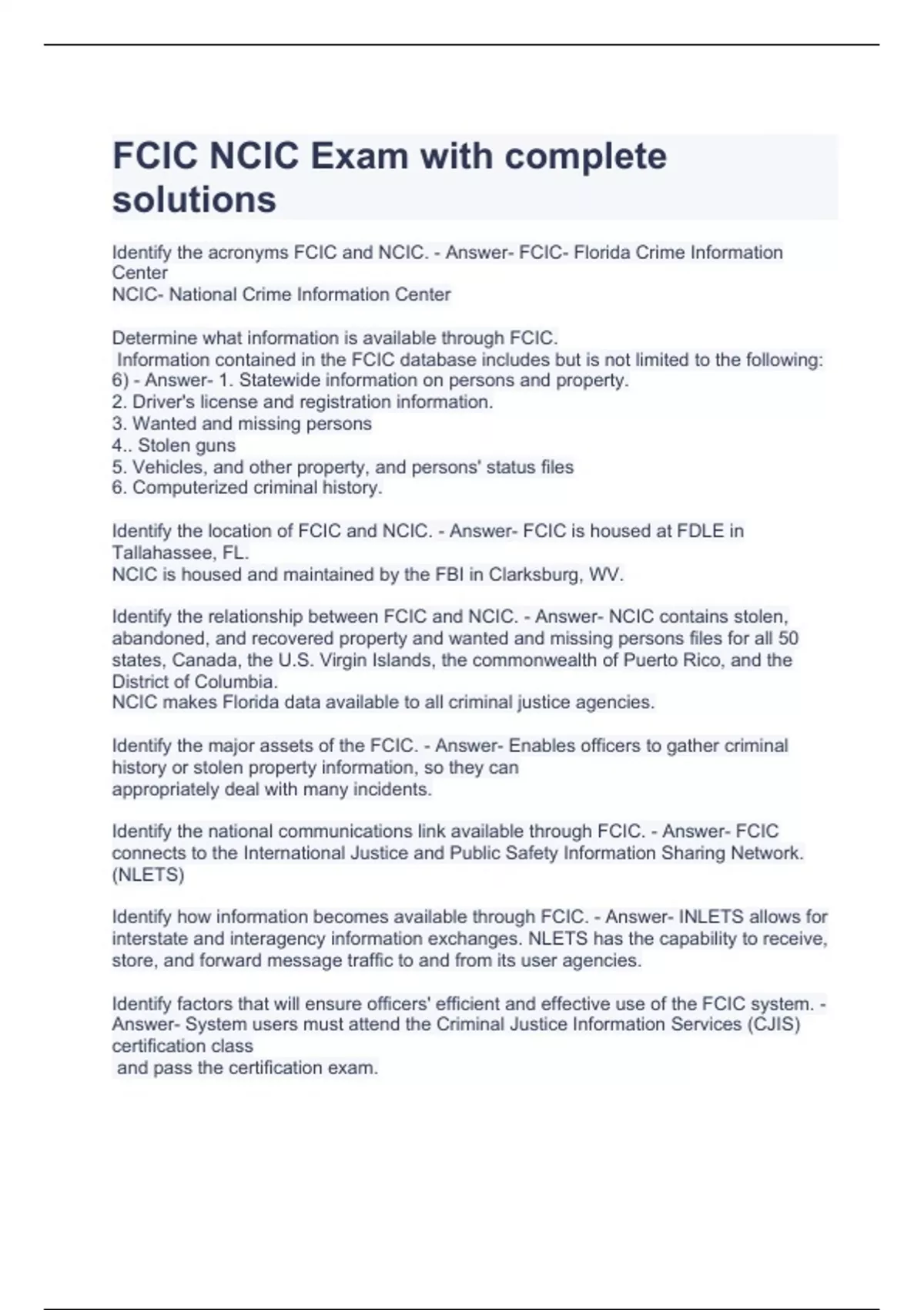 FCIC NCIC Exam with complete solutions FCIC NCIC TEST 2023 (SOLVED) FCIC NCIC Exam Questions and Answers 2023 FCIC/NCIC Exam Questions and Answers FCIC/NCIC QUIZ 2023 (ANSWERED) Florida Crime Information Center/National Crime Information Center Exam 2023