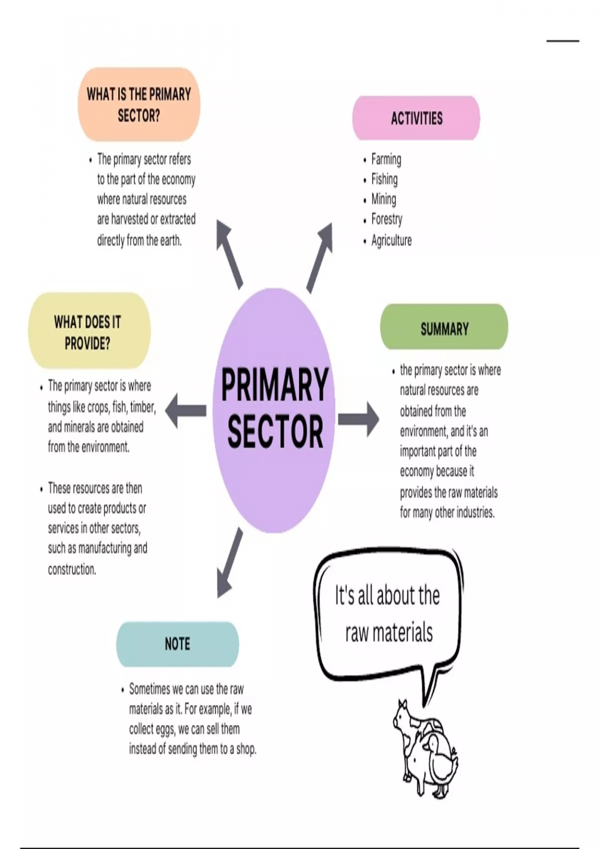 This document discusses the economic sectors, outlining their processes, products, and purposes of them in the form of a mindmap.