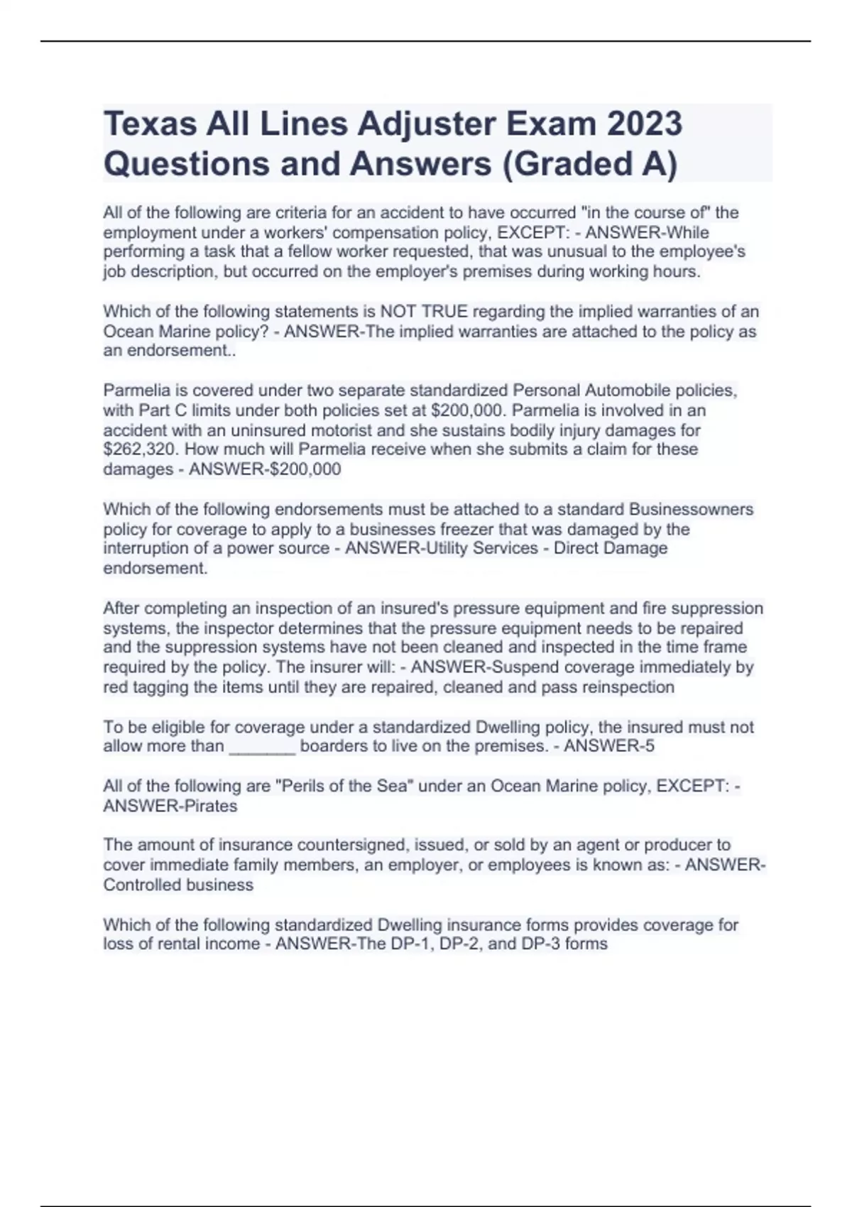Texas ALL LINES Adjuster Exam BUNDLE (FULL SOLUTION PACK GRADED A)Texas ALL LINES Adjuster Exam BUNDLE (FULL SOLUTION PACK GRADED A)